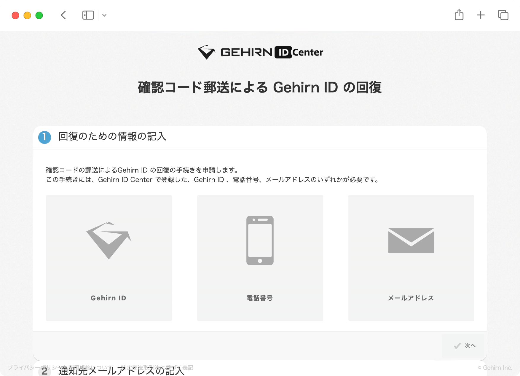 確認コードの郵送によるアカウントの回復の手続きを申請します。この手続きには、Gehirn ID Center で登録した、Gehirn ID、電話番号、メールアドレスのいずれかを選択します。