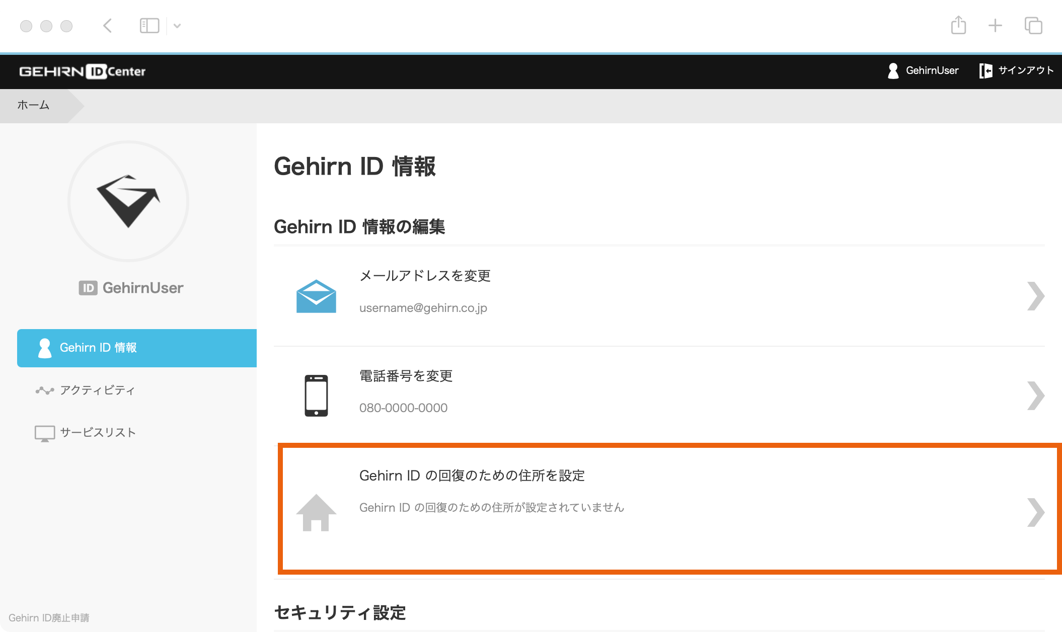 「Gehirn ID の回復のための住所を設定」を選択する ¶