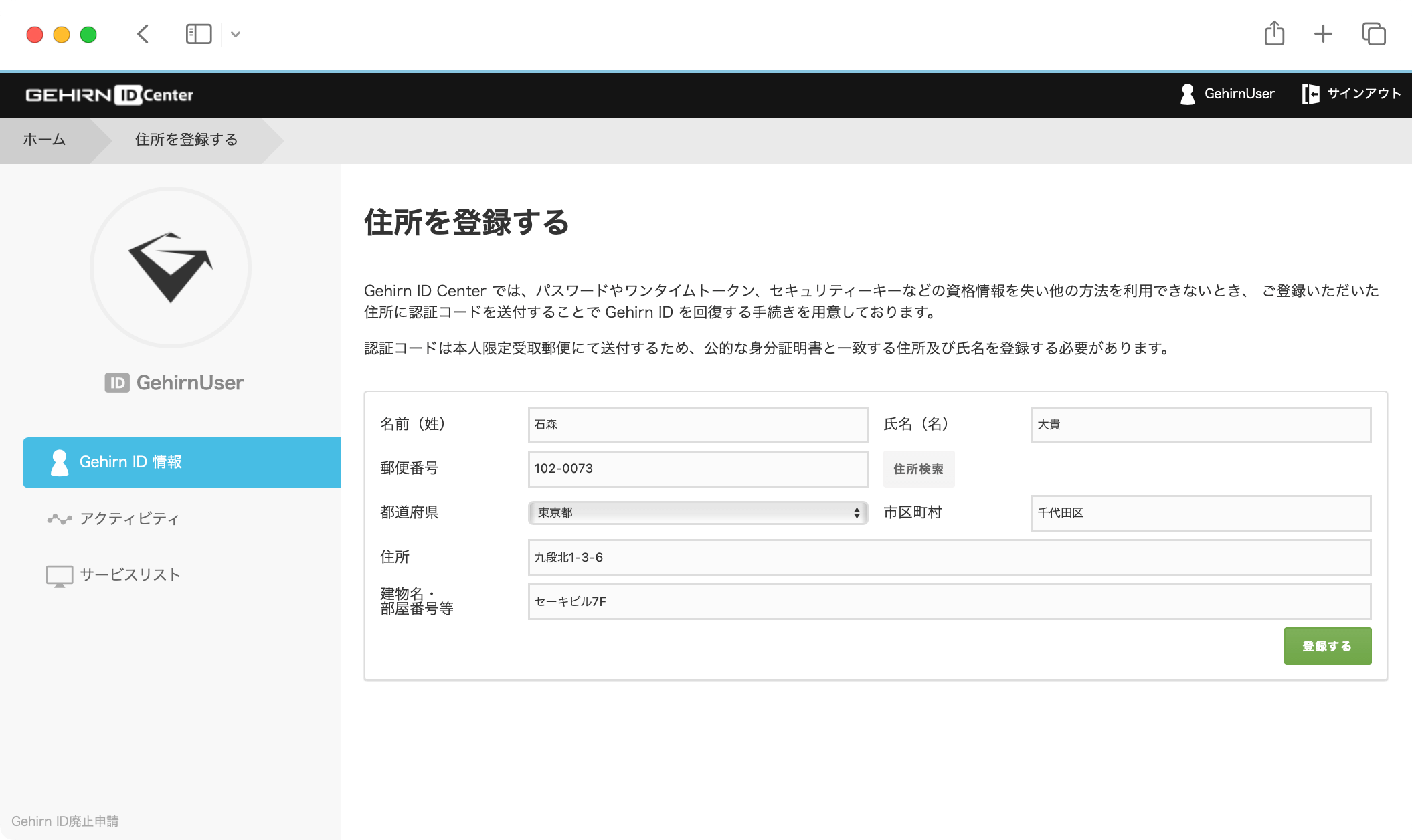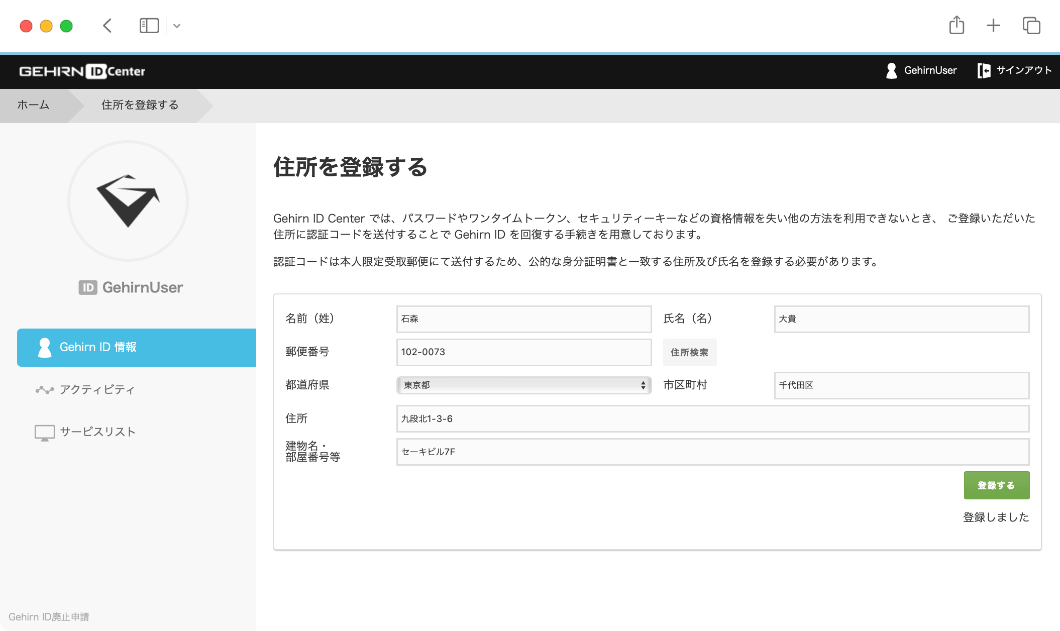 アカウント情報画面の「Gehirn ID の回復のための住所を設定」を選択します。