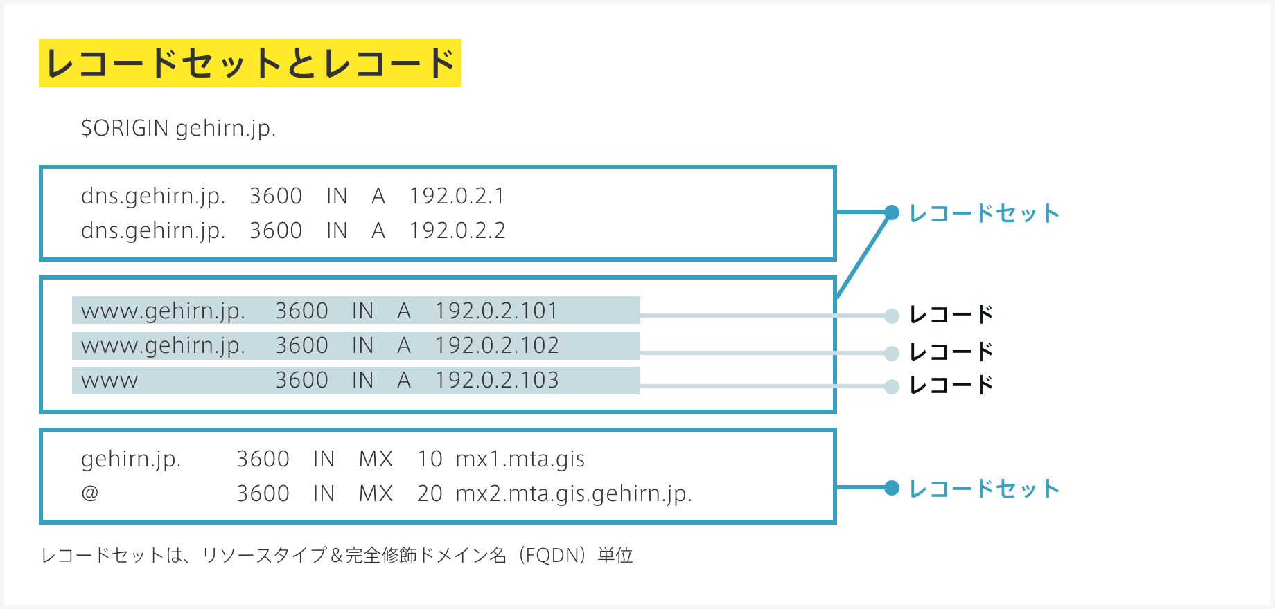 各レコード セットは完全修飾ドメイン名(FQDN)とリソースタイプの組み合わせです。同一のレコード セットをゾーン内に複数作成することはできません。 - レコード