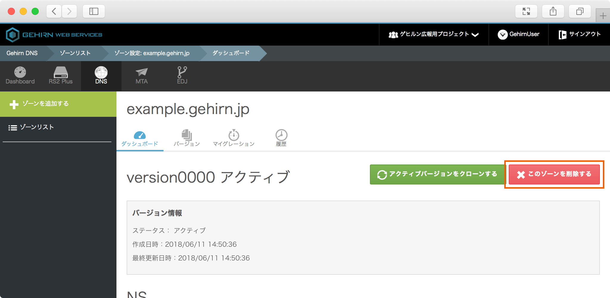 ダッシュボードの右上の「このゾーンを削除」ボタンをクリックします。