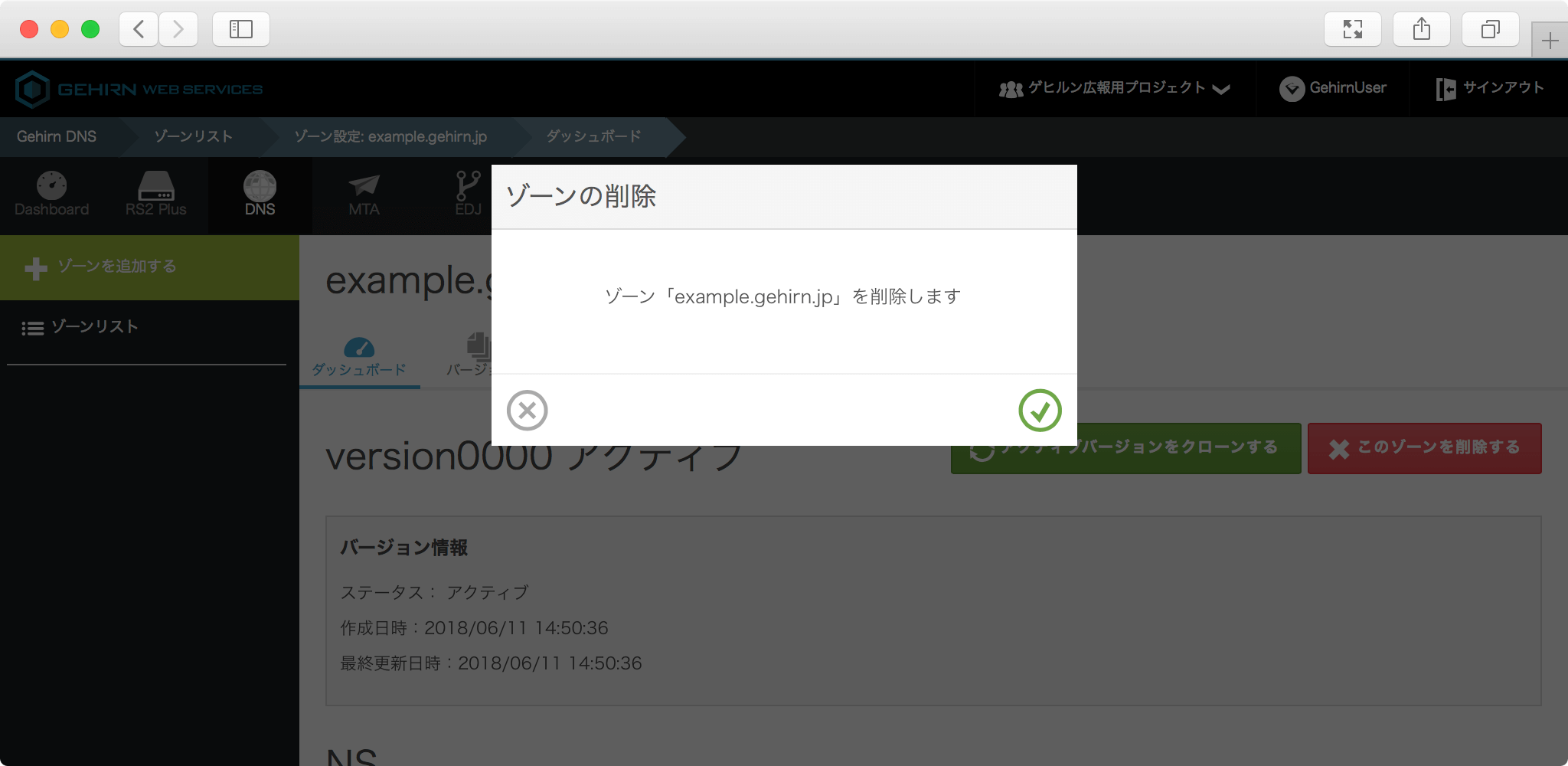 削除を行って良い場合には、表示された確認ダイアログ右下のチェックマークをクリックします。 ゾーンの削除が完了すると自動的にモーダルウィンドウが閉じます。