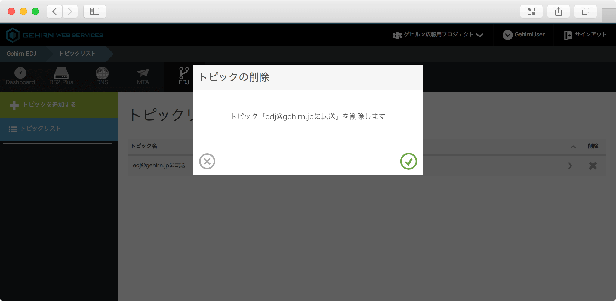 対象のトピックの右側にある削除ボタンをクリックしてモーダルウィンドウを開きます。