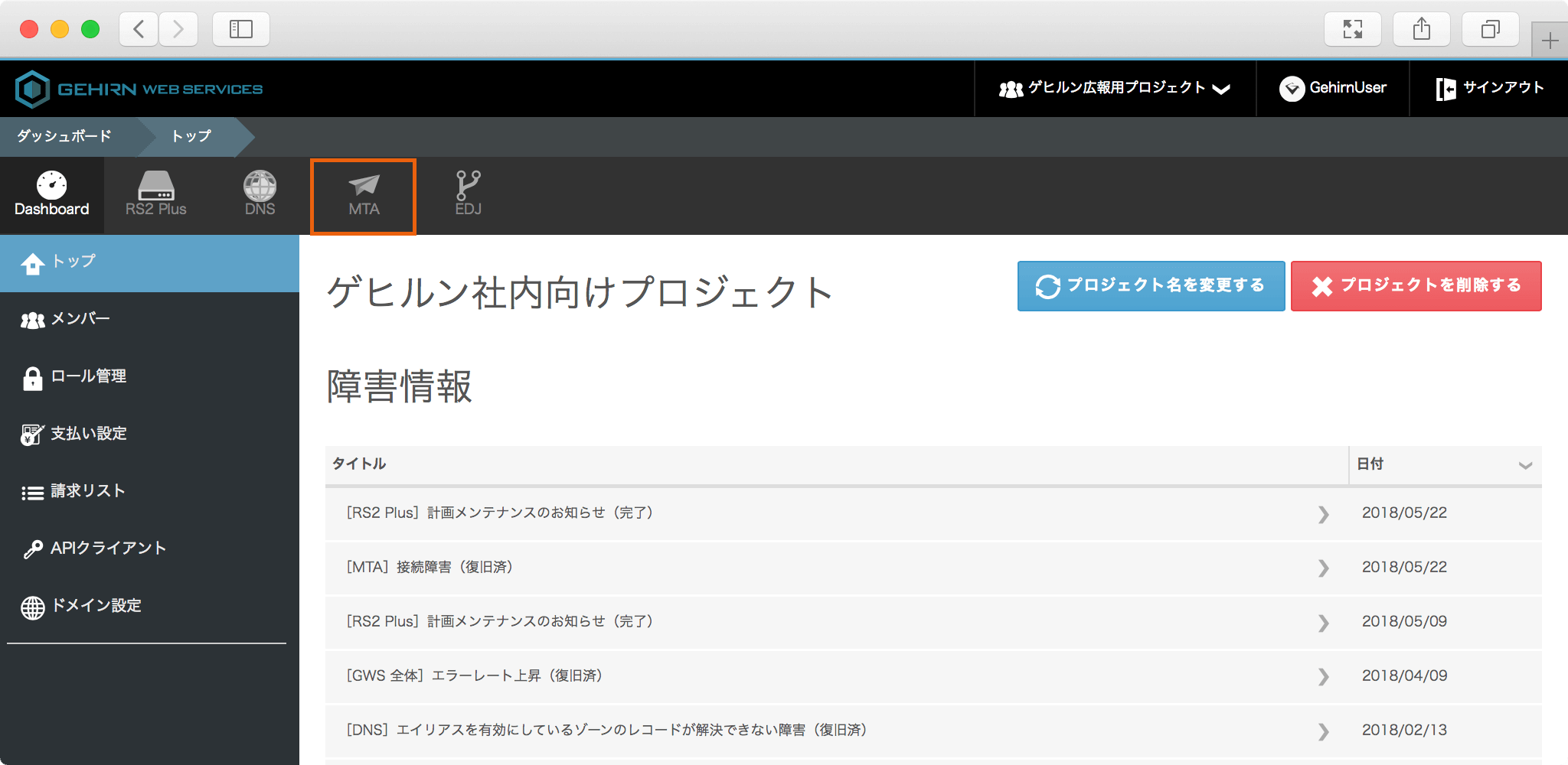 GWS Web コンソールを開いて、操作対象のプロジェクトを選択してから、MTA タブを開きます。