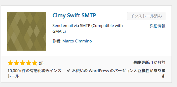 プラグインのインストール画面から、「Cimy Swift SMTP」プラグインをインストールします。