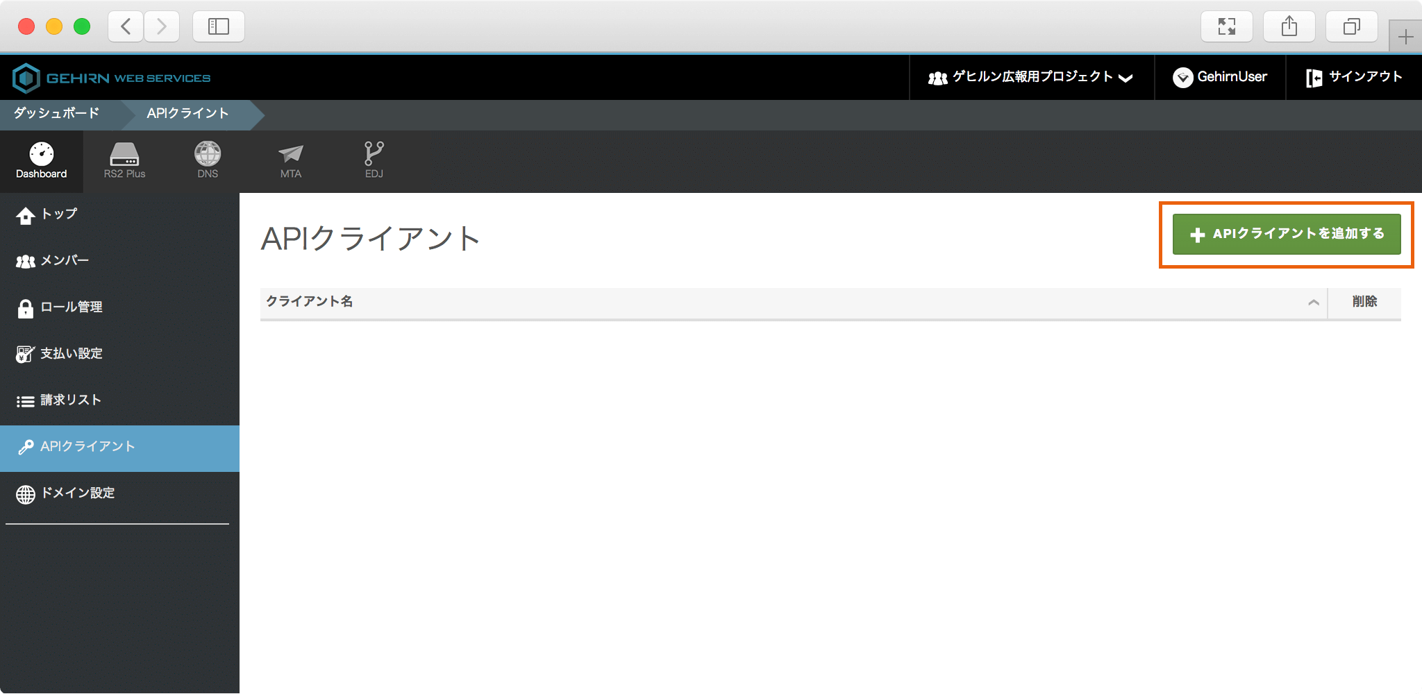ダッシュボードから API クライアントを選択し、API クライアントページへ移動します。
