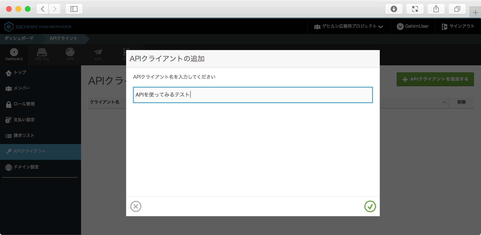 モーダルの右下にあるチェックボタンをクリックすると、API クライアントが追加されます。