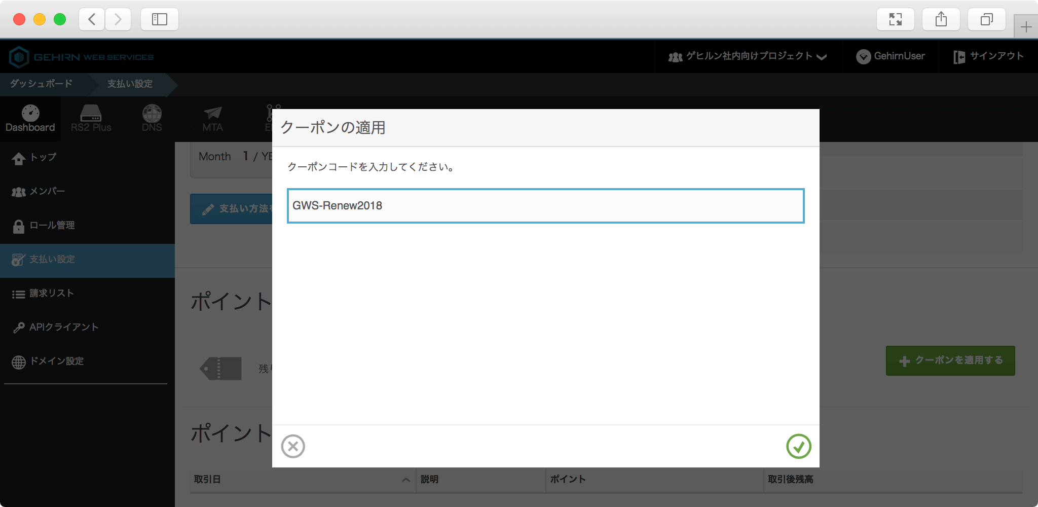 モーダルの右下にあるチェックボタンをクリックすると、入力したクーポンのポイント残高が追加されます。