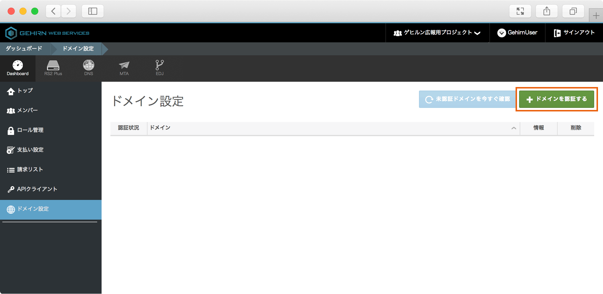 ドメインを認証するボタンをクリックし、追加するドメイン名を入力します。