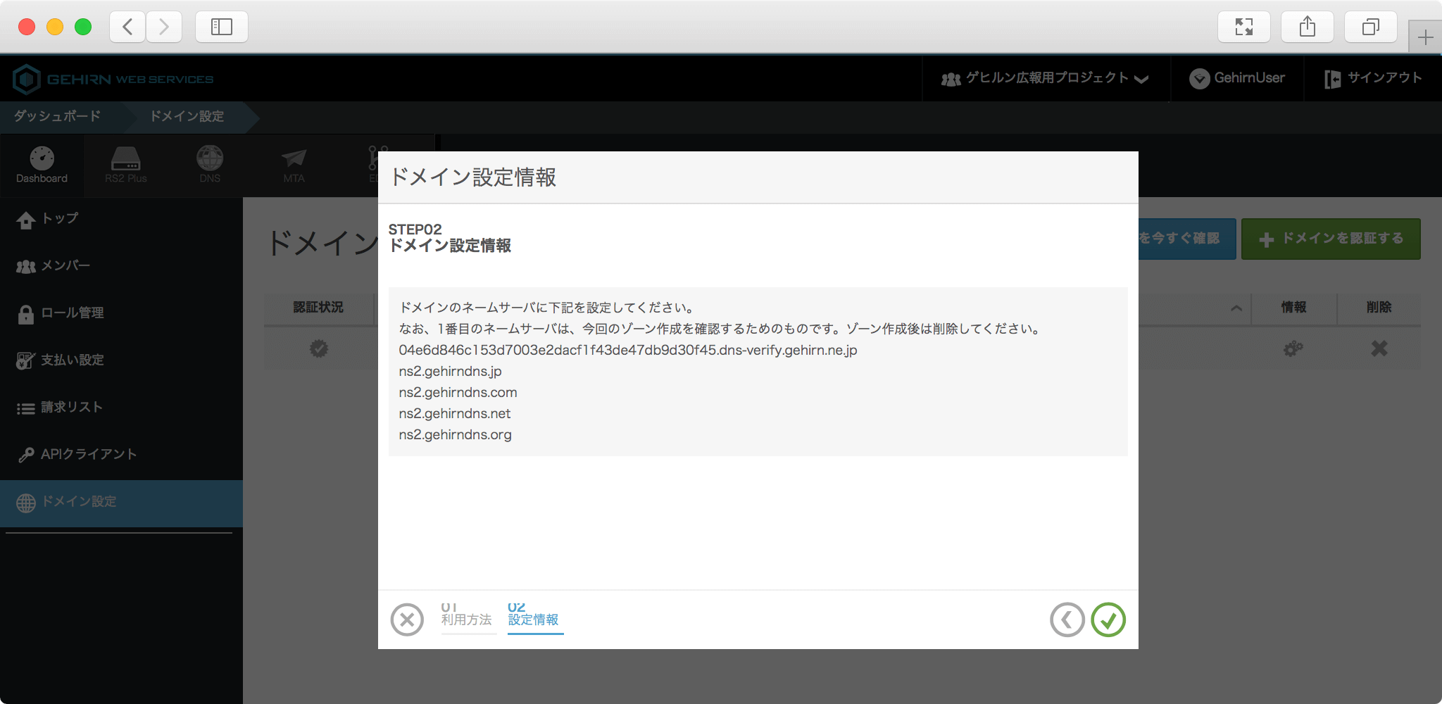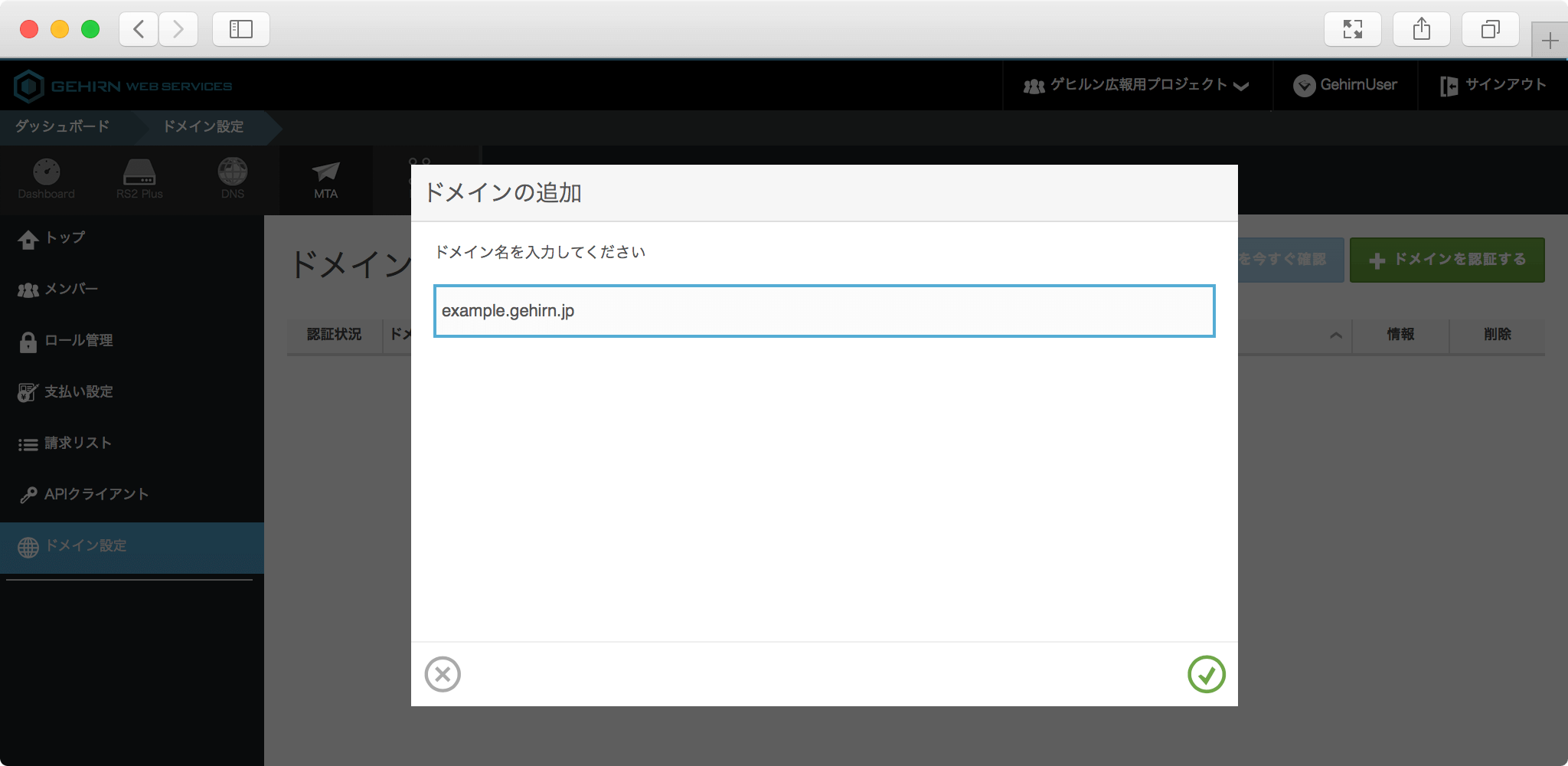 モーダルの右下にあるチェックボタンをクリックすると、ドメインが追加されます。