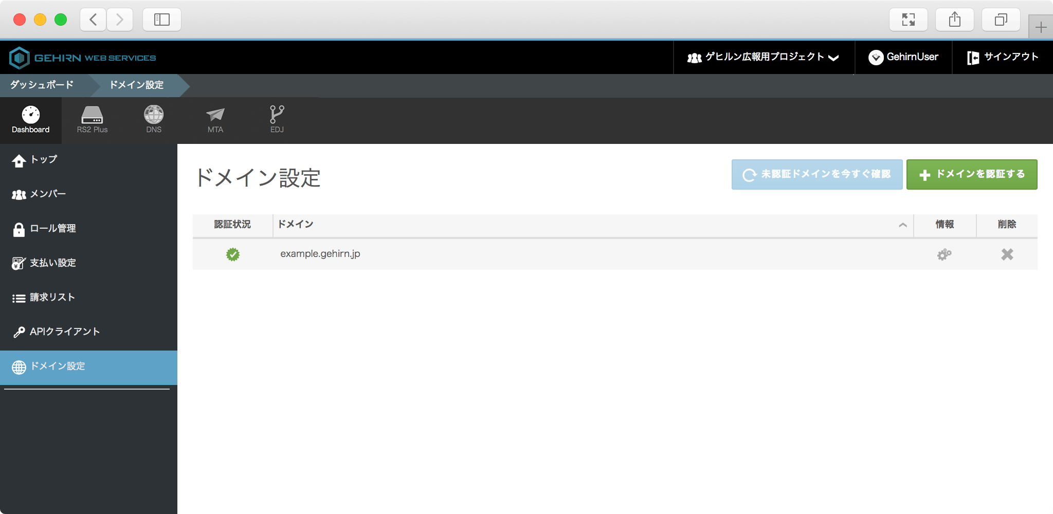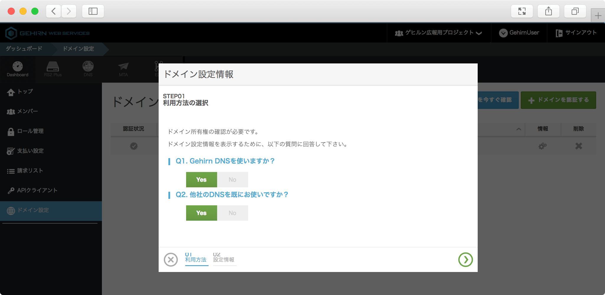 ダッシュボードからドメイン設定を選択し、ドメイン設定ページへ移動します。