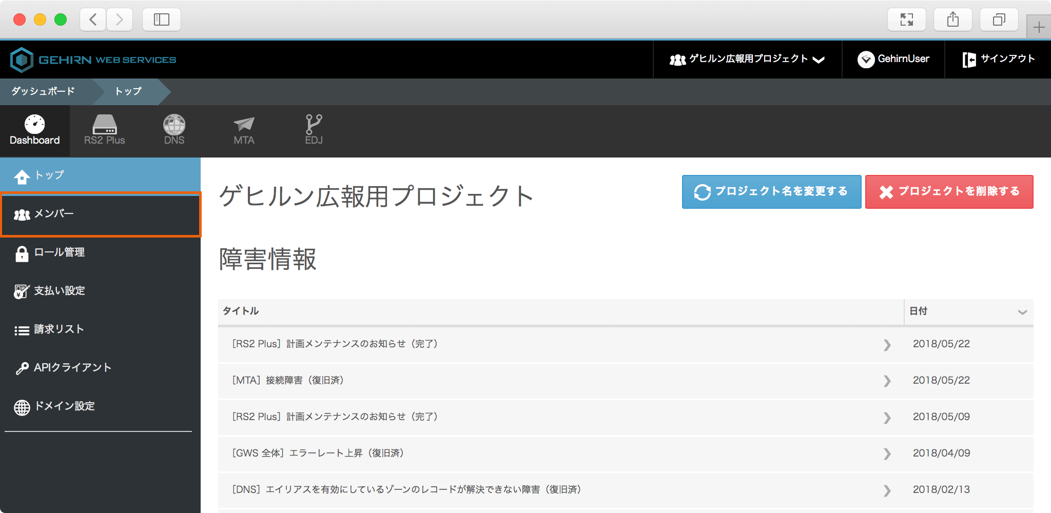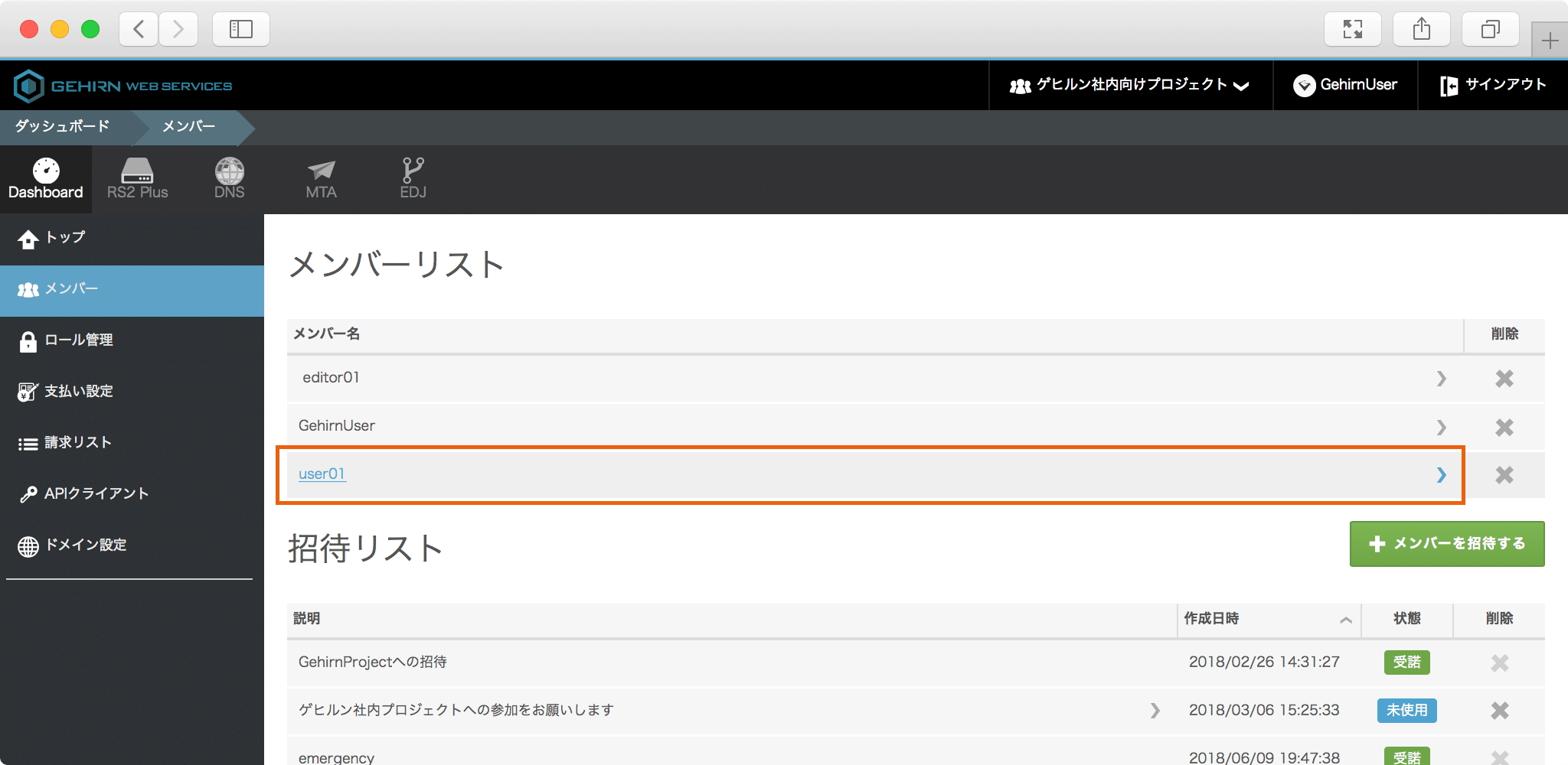 ダッシュボードからメンバーを選択し、メンバーリストへ移動します。