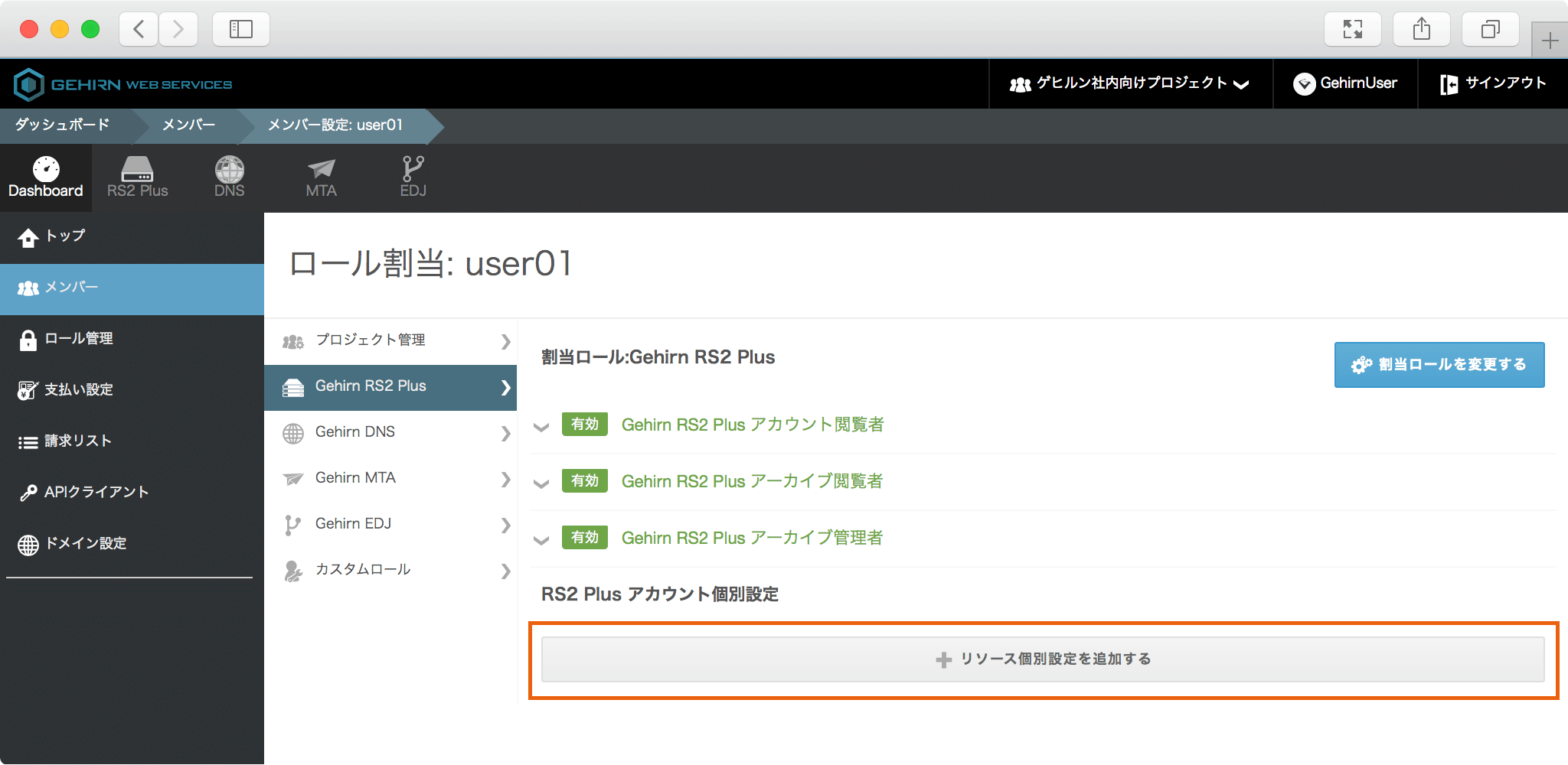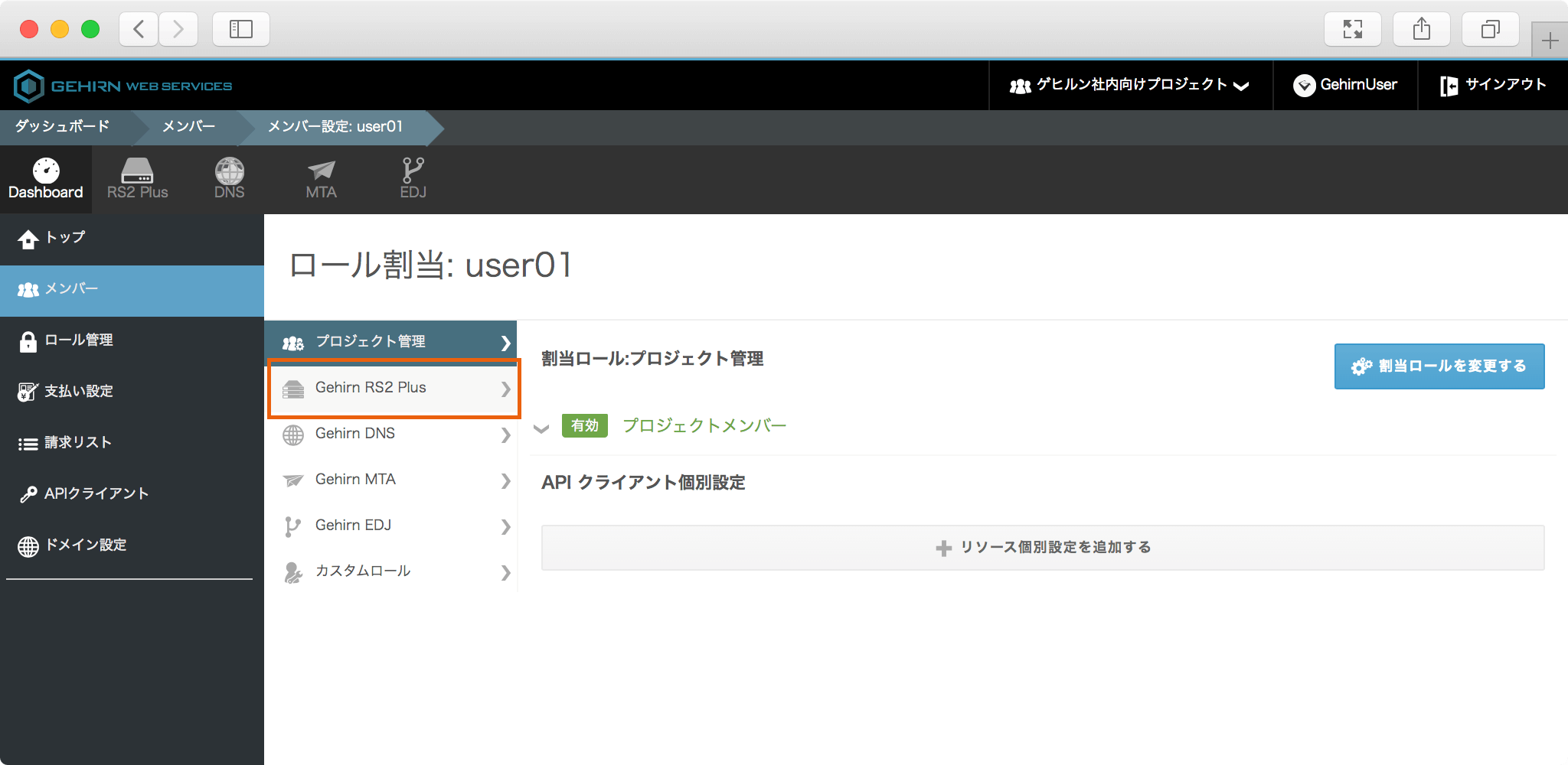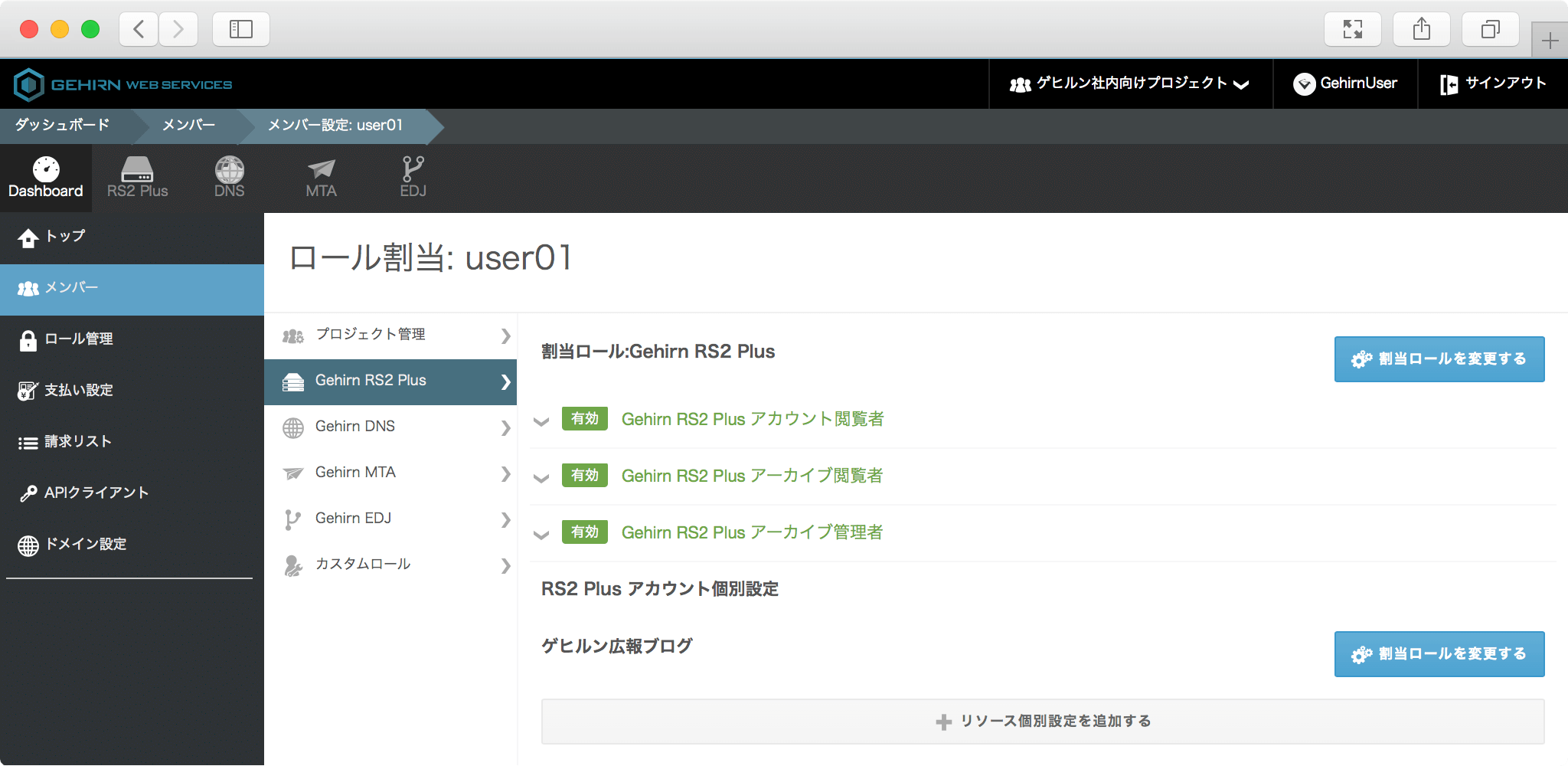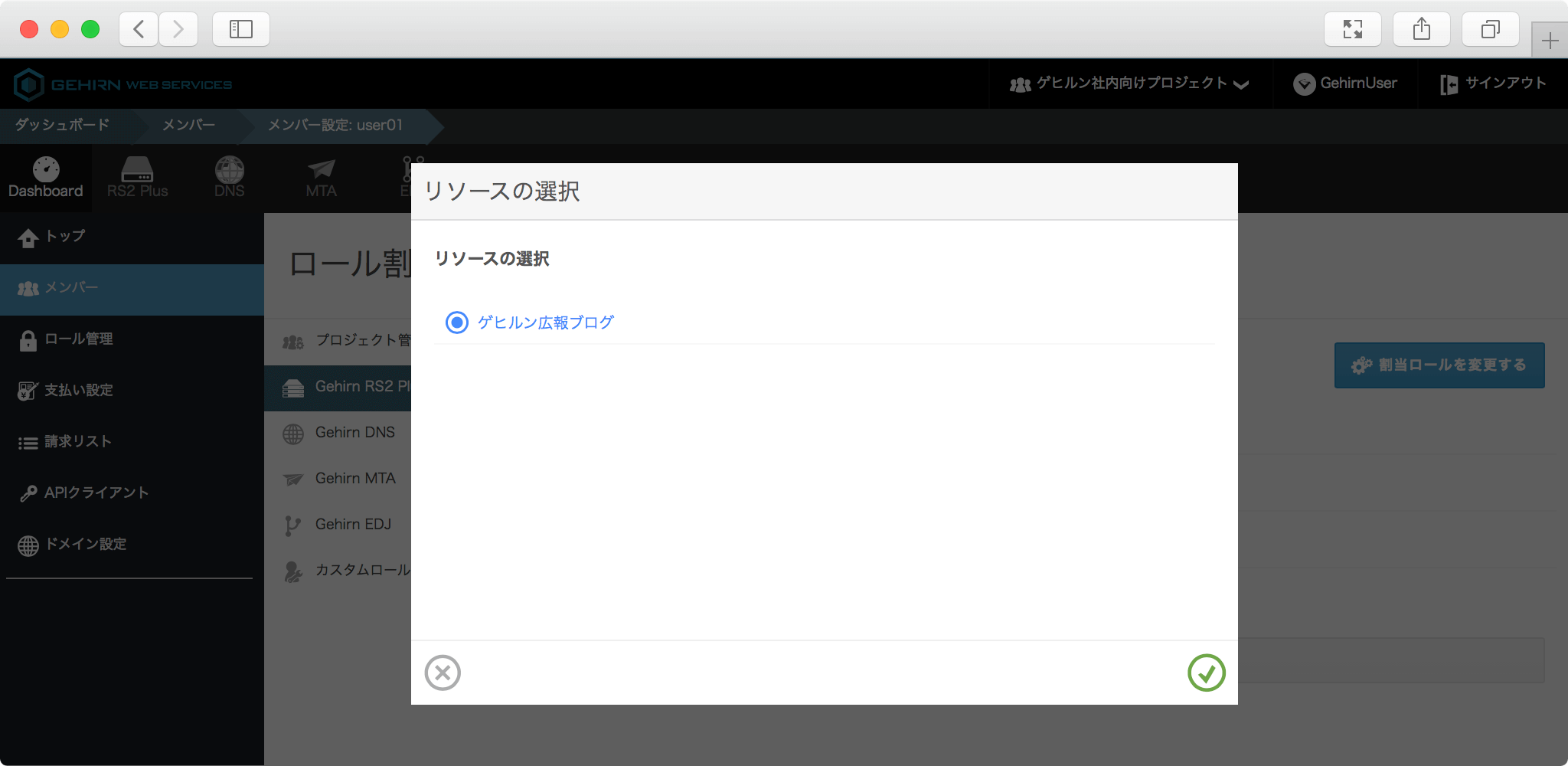 ロールを割当てるメンバー名を選択し、ロール割当ページへ移動します。