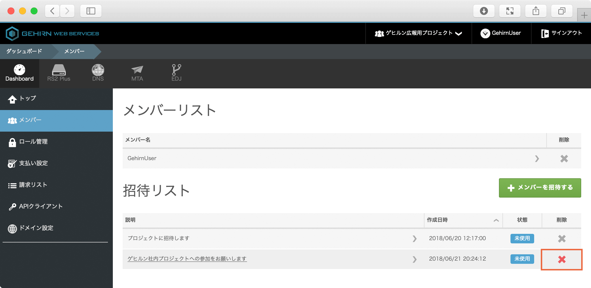 招待を取消す該当項目を選択し、右の削除ボタンをクリックします。