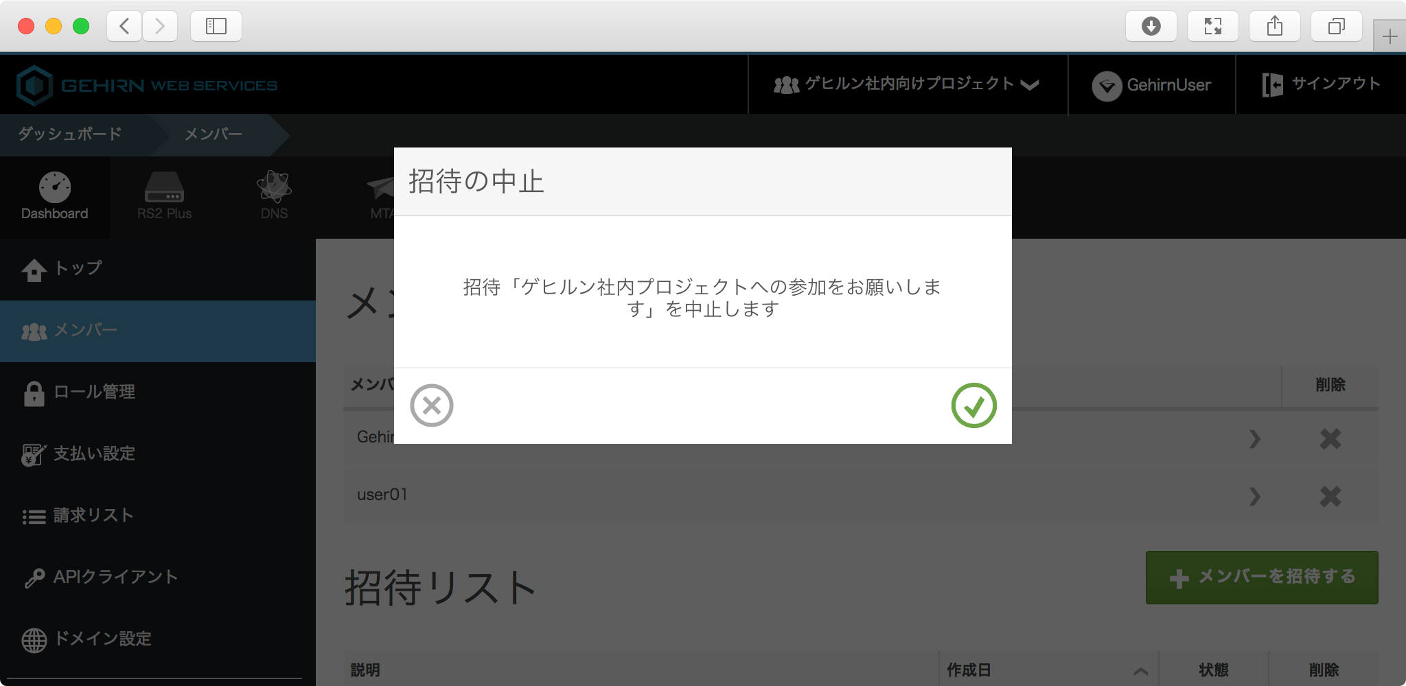招待の中止のモーダルを確認し、チェックボタンをクリックして中止ができます。