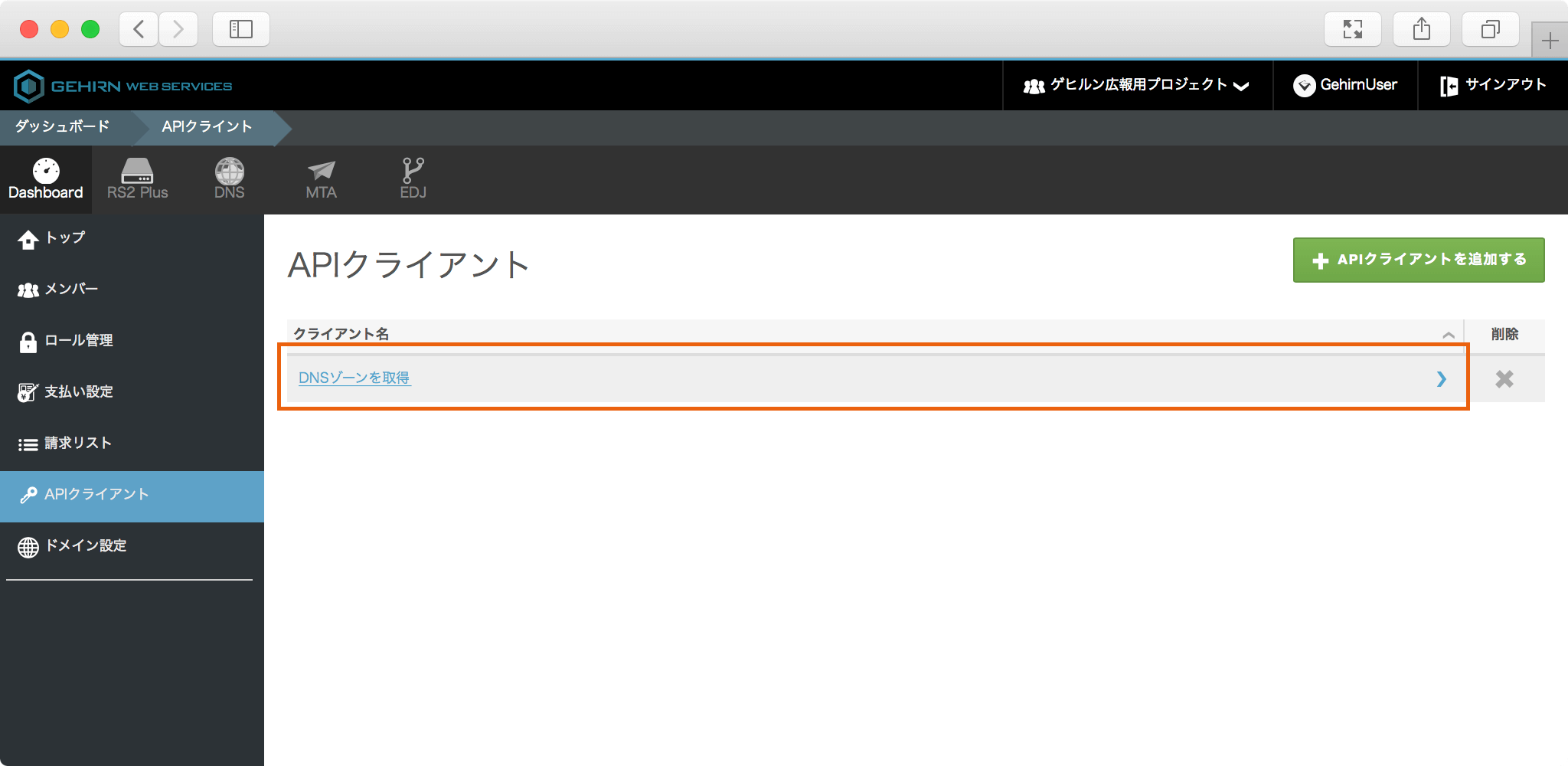 ダッシュボードから API クライアントを選択し、API クライアントページへ移動します。