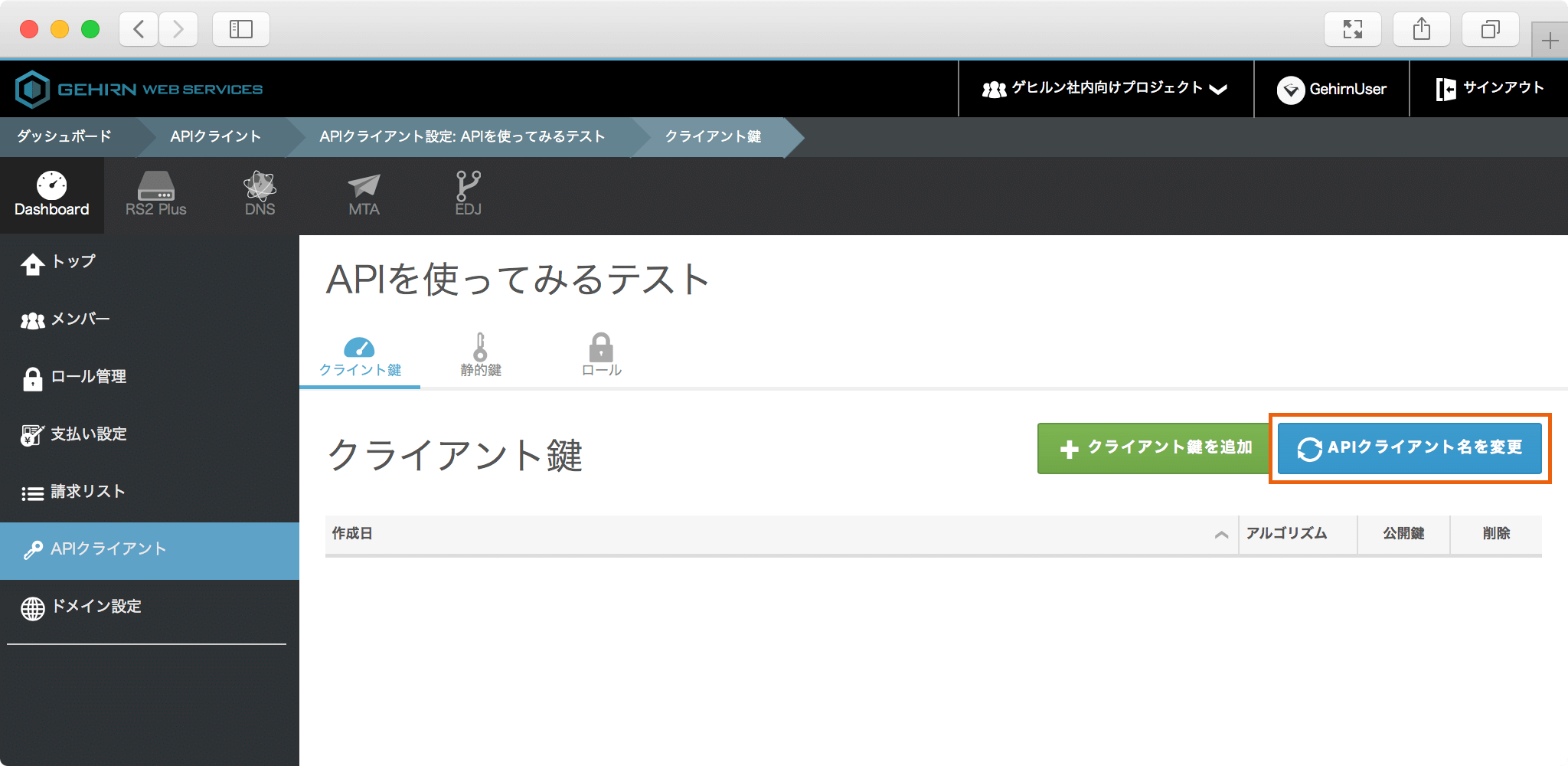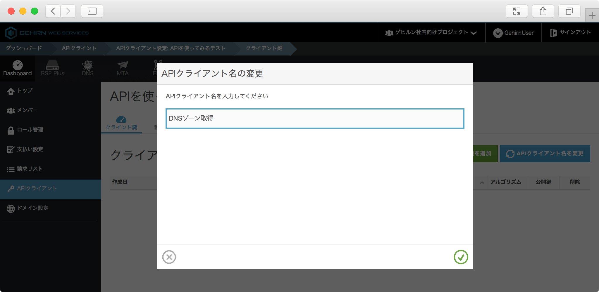 モーダルの右下にあるチェックボタンをクリックすると新しい API クライアント名が適用されます。