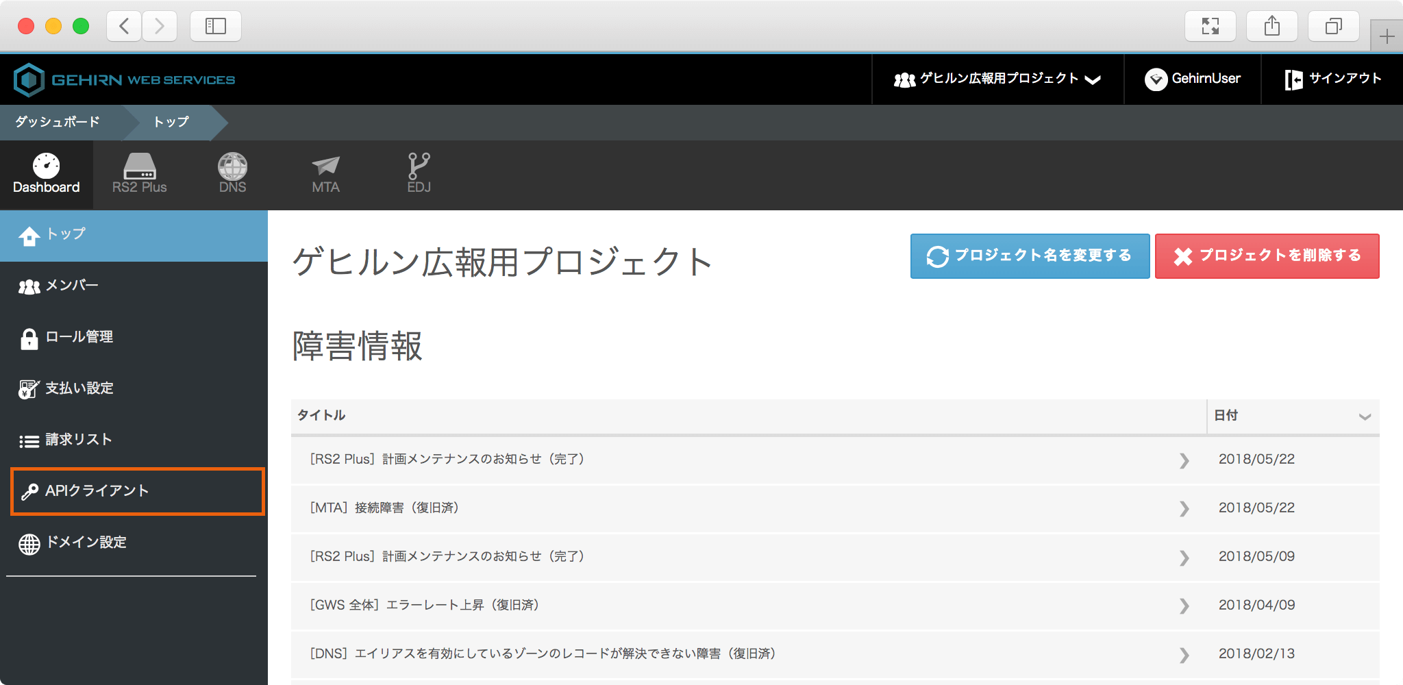 ダッシュボードから API クライアントを選択し、API クライアントページへ移動します。