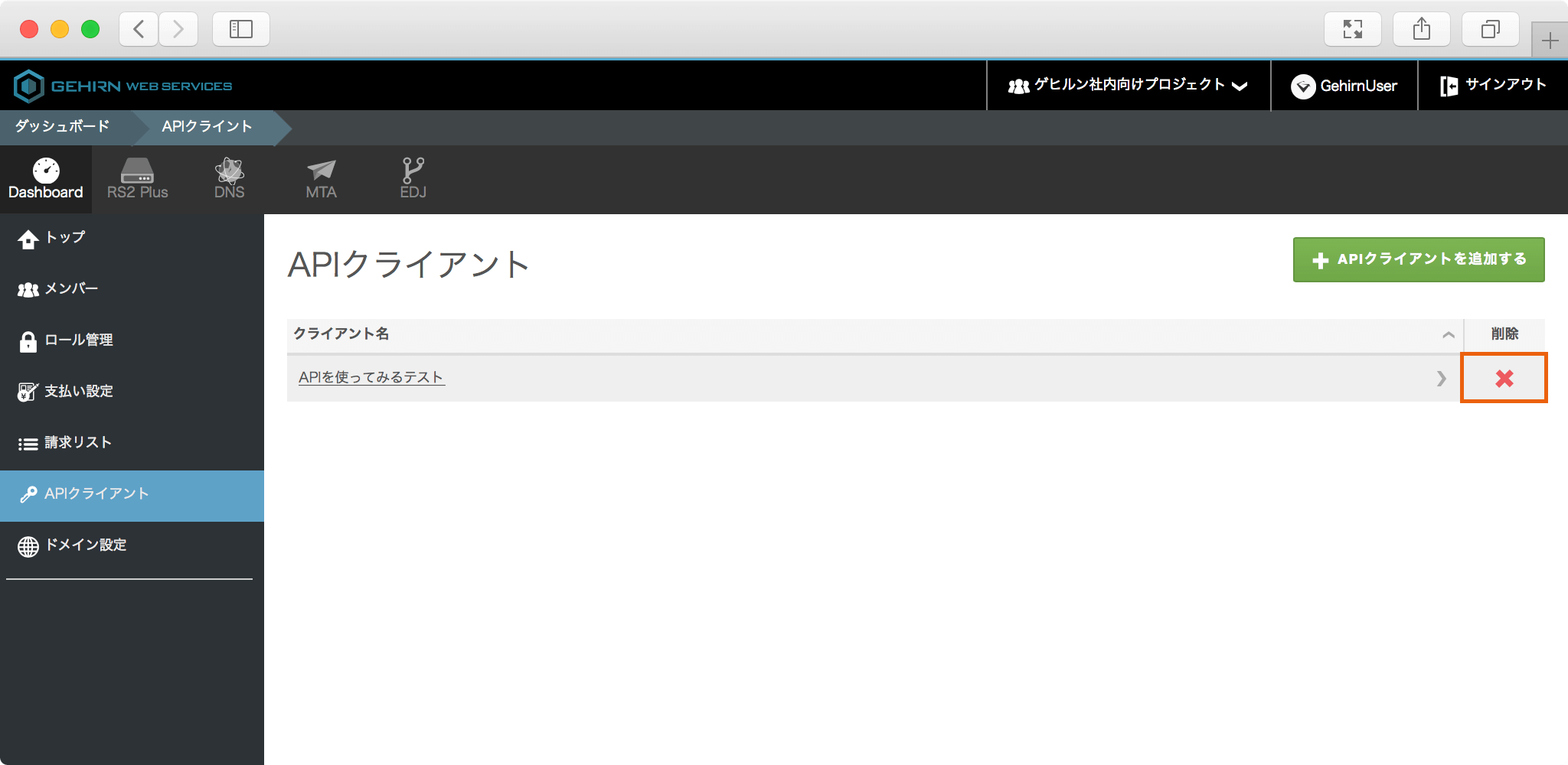 削除したい API クライアントの削除ボタンをクリックします。