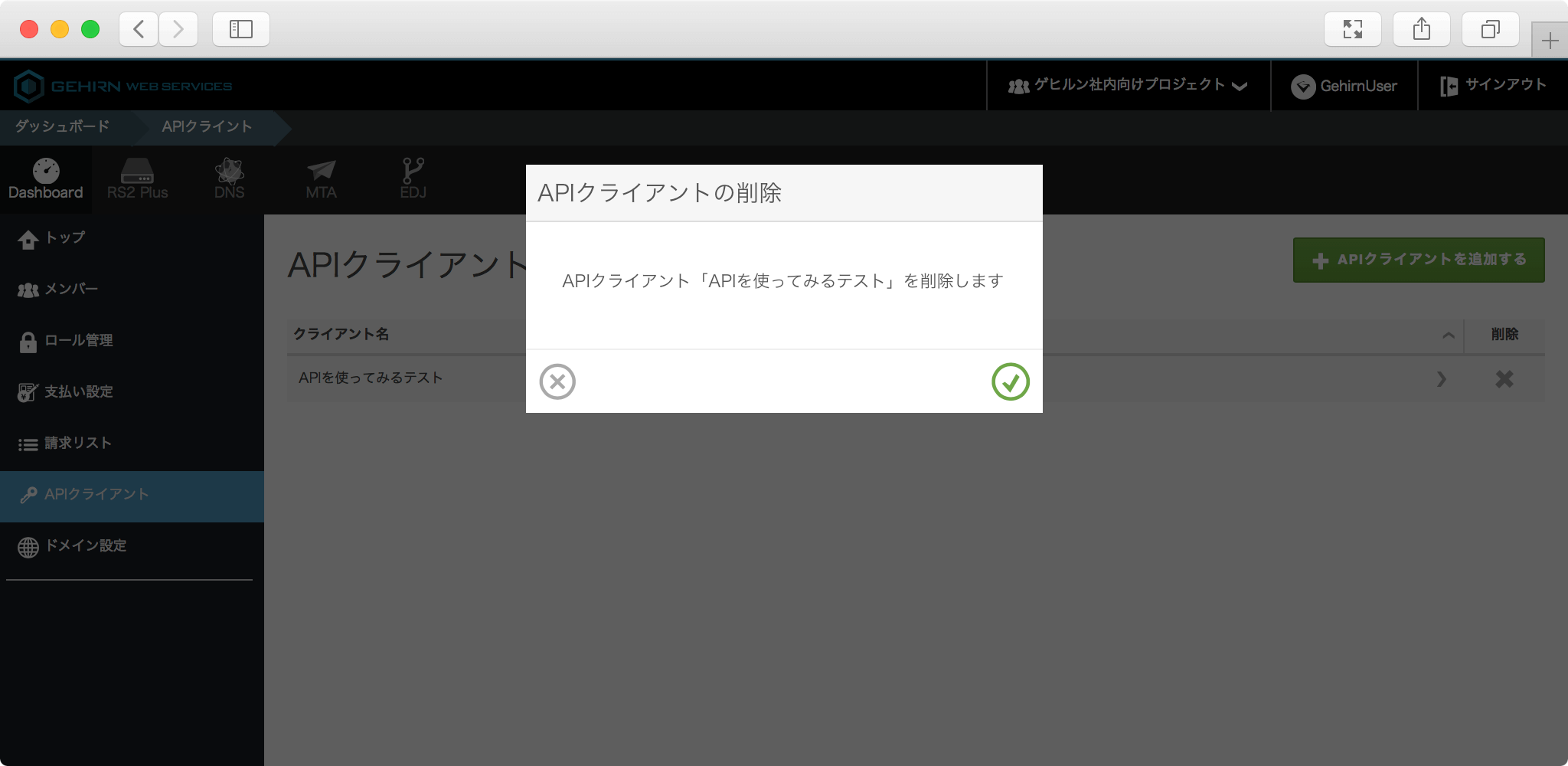 モーダルを確認し、右下のチェックボタンをクリックすると API クライアントが削除されます。