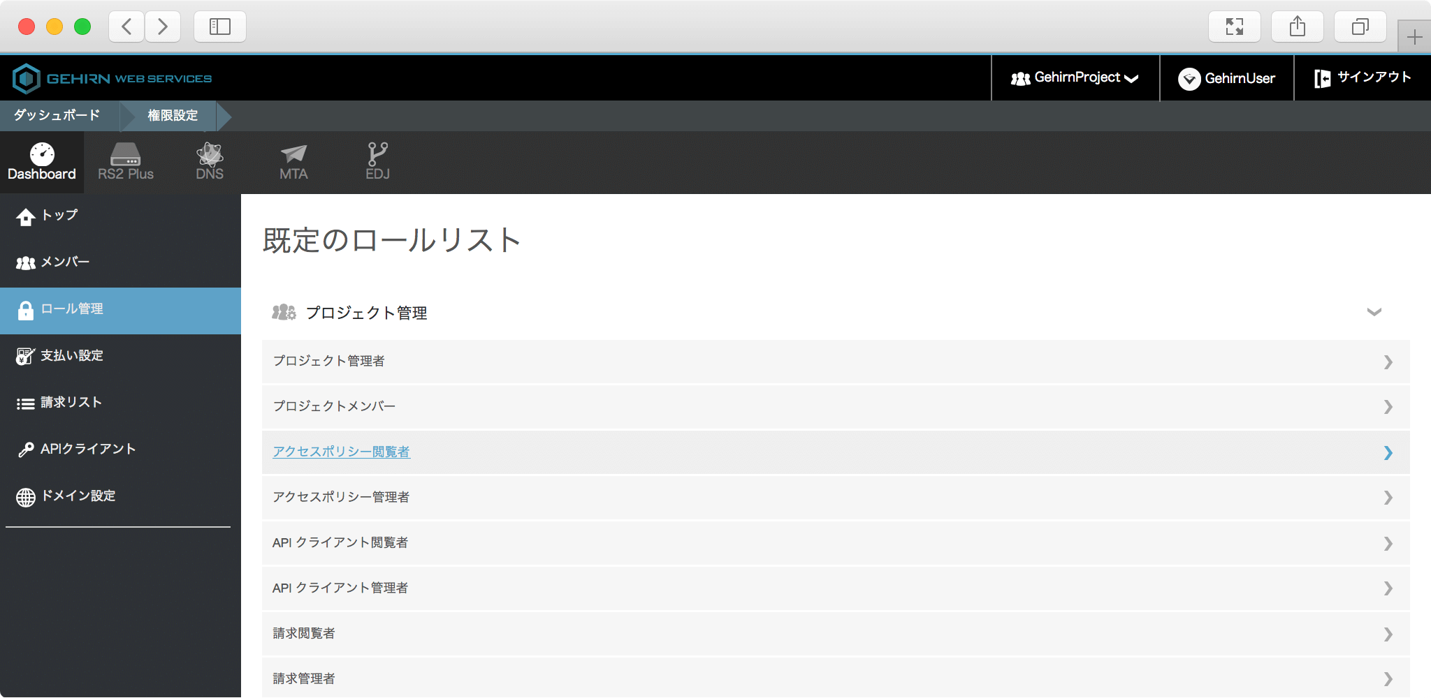 サービス名を選択すると現在のロールの設定を閲覧できます。