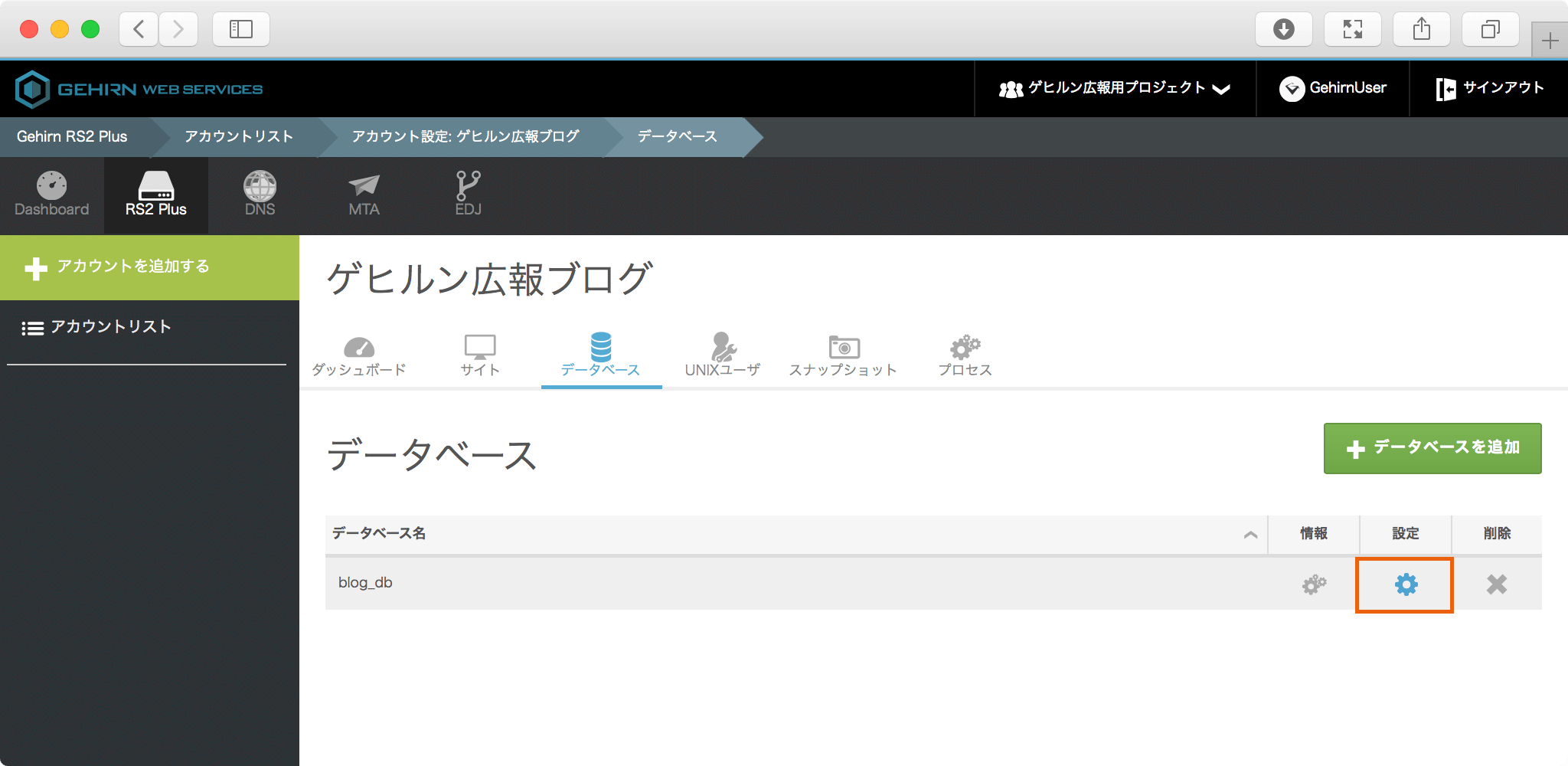 契約一覧の画面から対象のアカウントを開いて、データベースタブを選択してください。