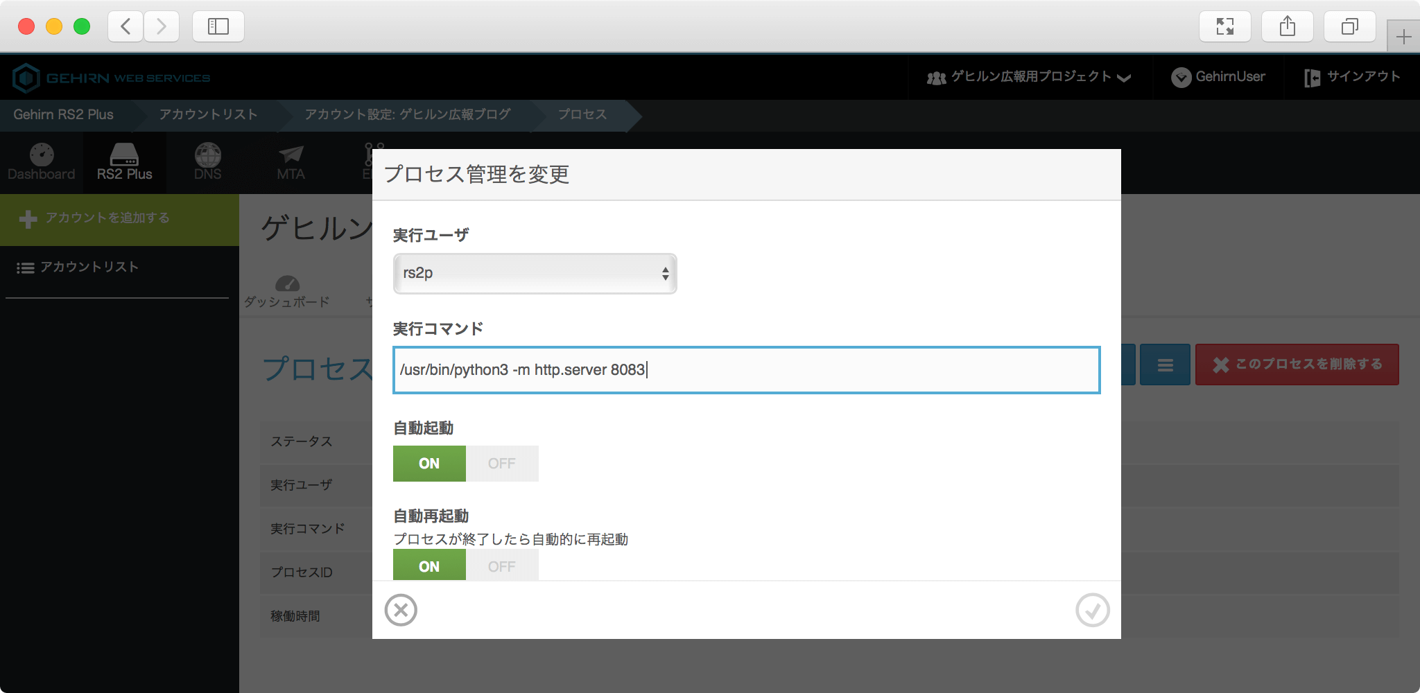 プロセスの実行ユーザや実行パスが変更されると、プロセスが一旦終了し、新たに起動します。プロセスの終了でプロセスが実行中だった処理が中断されることがありますので注意してください。