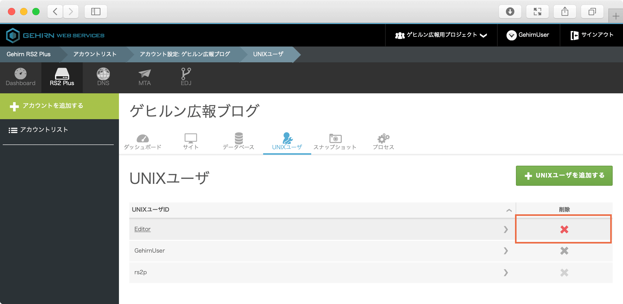 対象のアカウントの UNIX ユーザタブを開く ¶