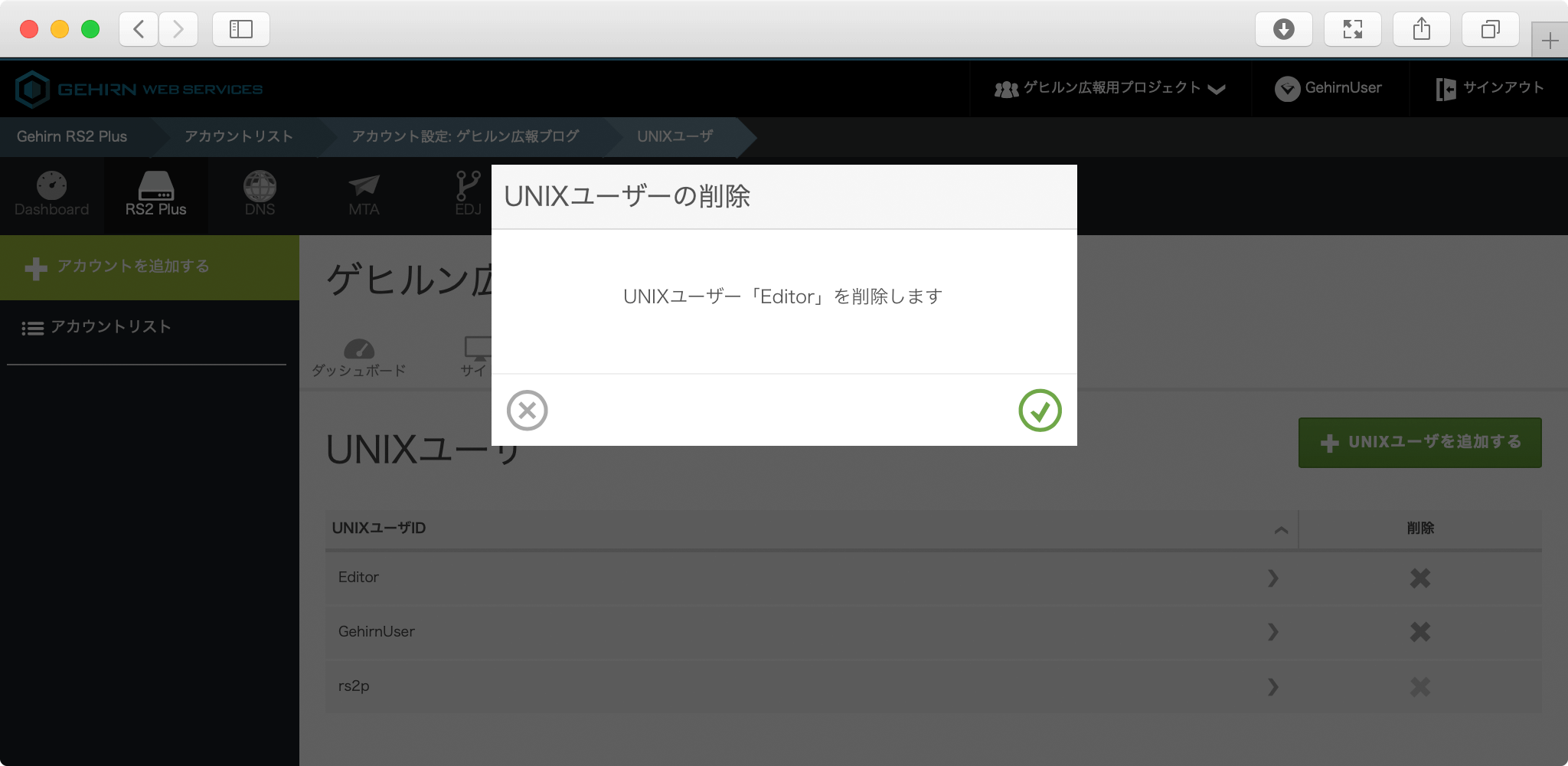 モーダルウィンドウを確認し、同ウィンドウ右下のチェックマークをクリックするとユーザが削除されます。