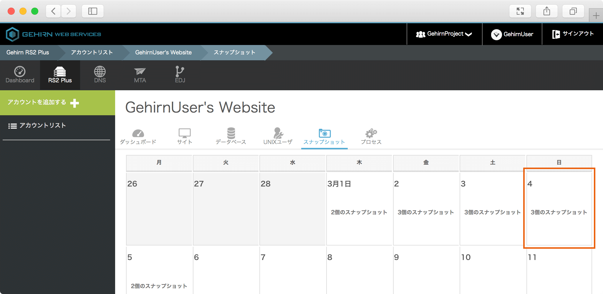 契約一覧の画面から対象のアカウントを開いて、スナップショットタブを選択してください。