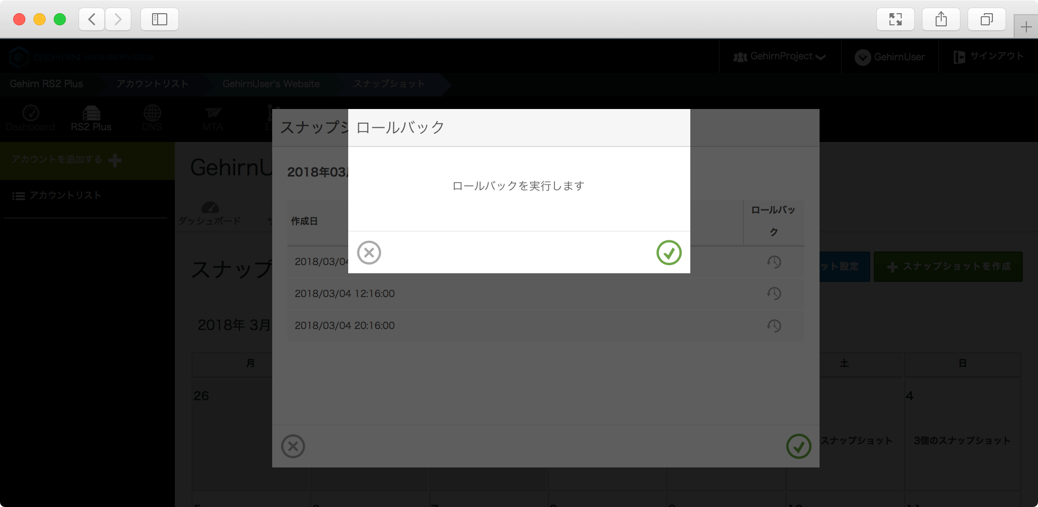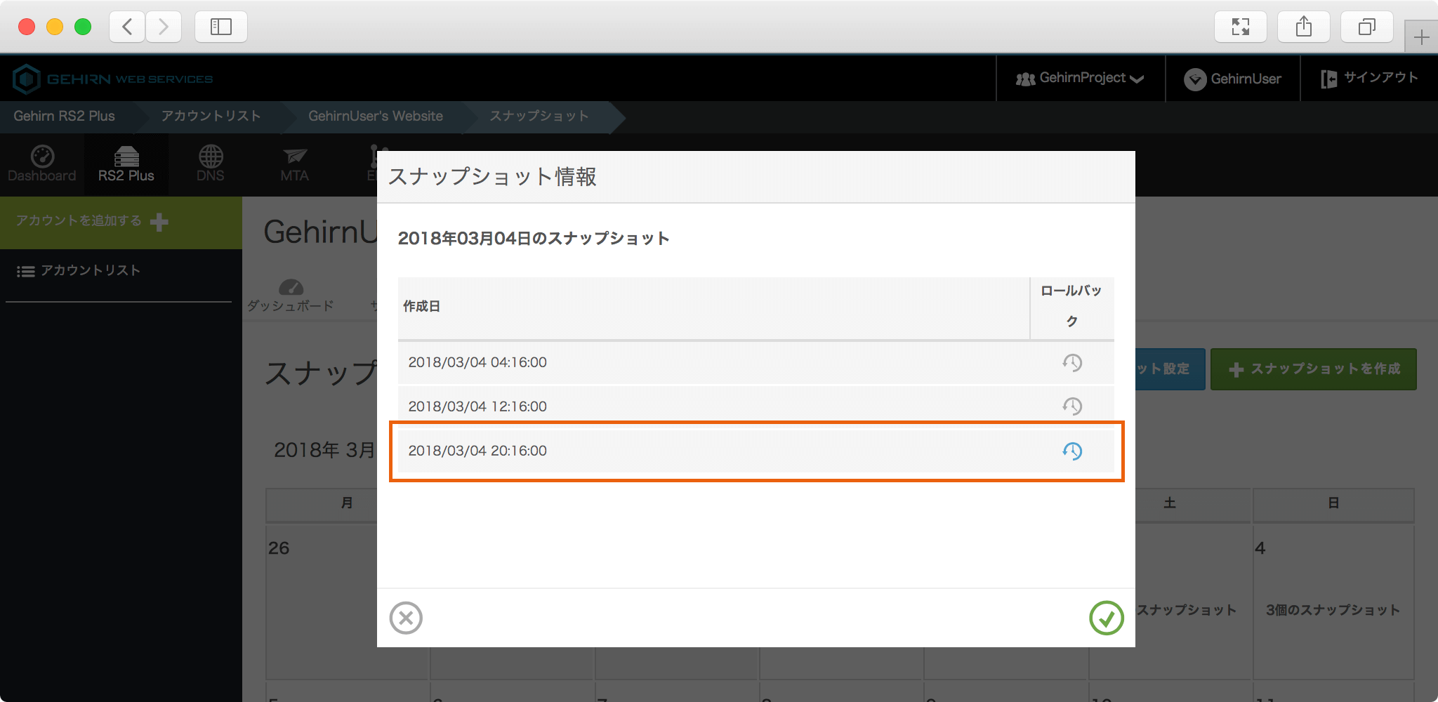 カレンダーの中からロールバックするスナップショットを選択してください。モーダルウィンドウが開きます。