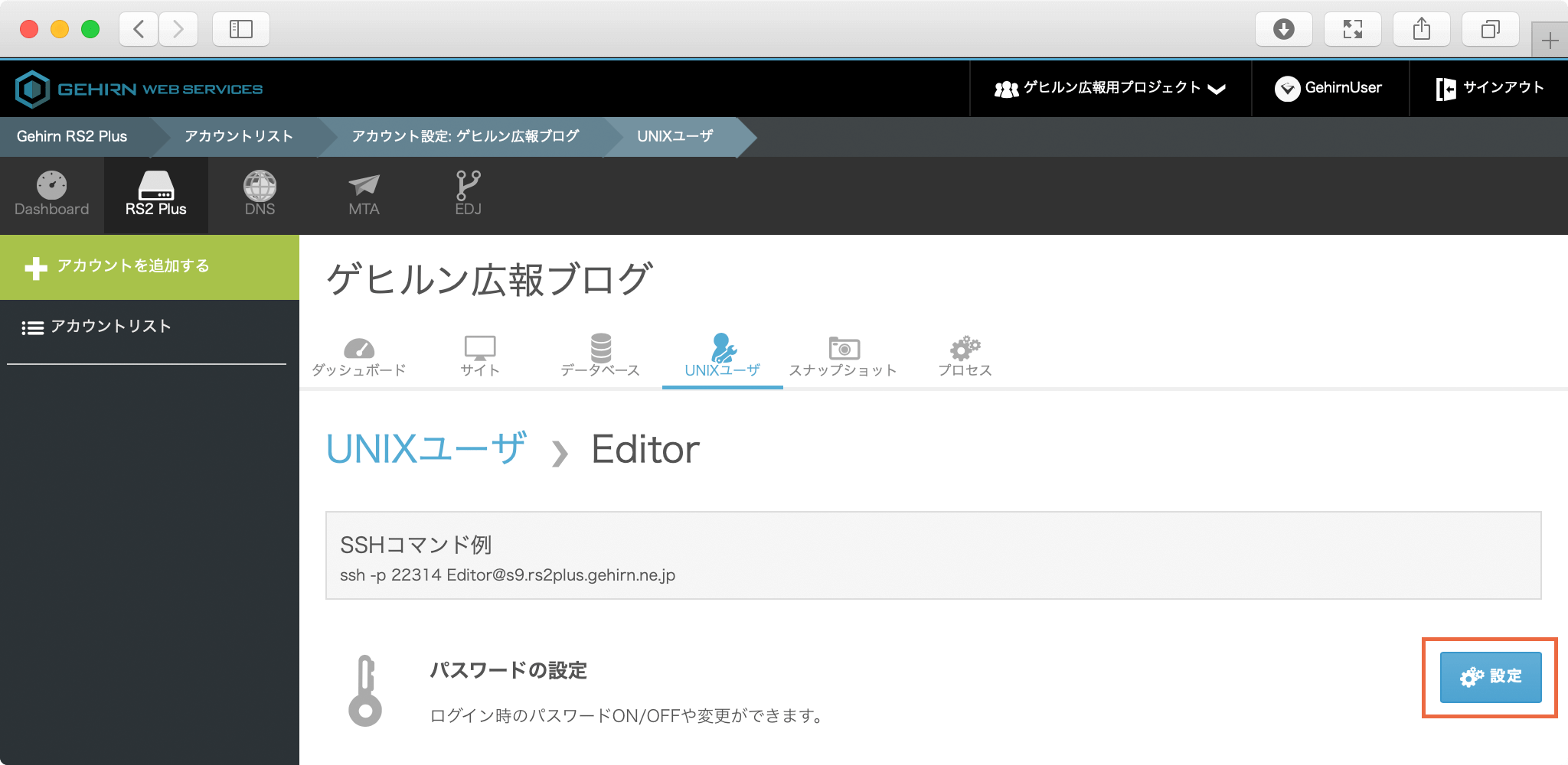 契約一覧の画面から対象のアカウントを開いて、UNIX ユーザタブを選択してください。
