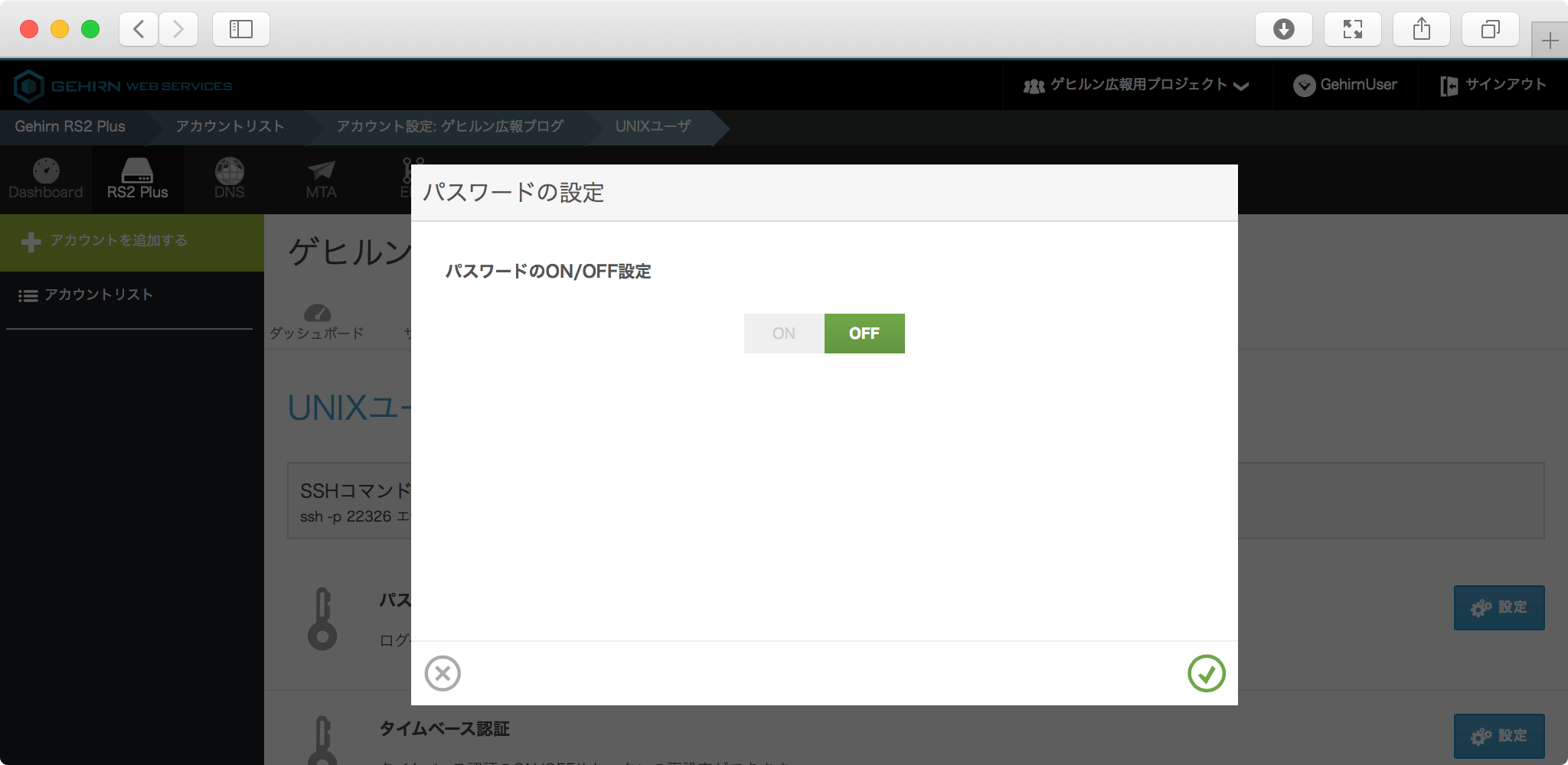 パスワードの ON/OFF 設定では、ON にするとパスワード認証が有効になります。