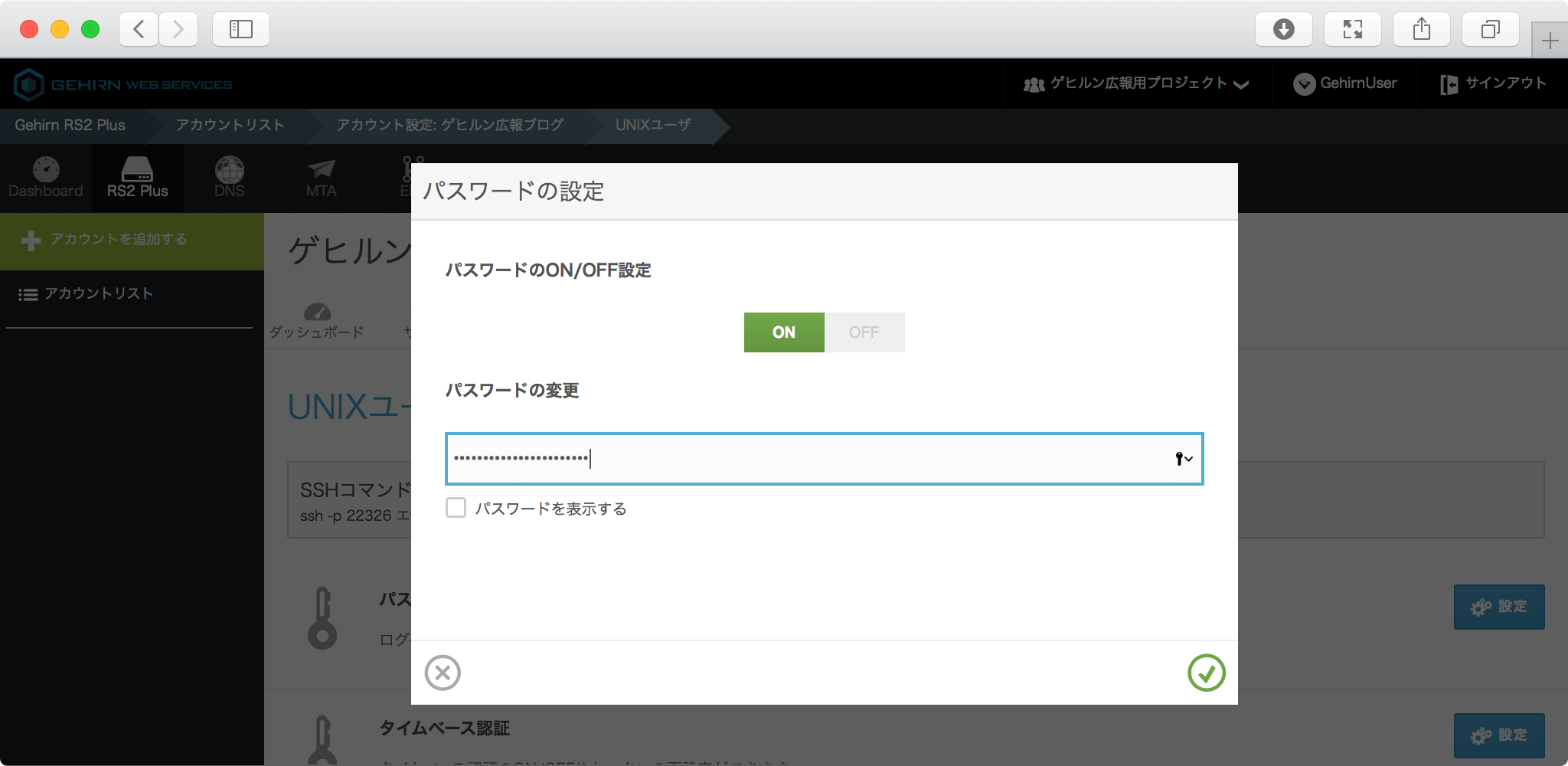 「パスワードの設定」行の右にある「設定」ボタンをクリックするとモーダルウィンドウが開きます。