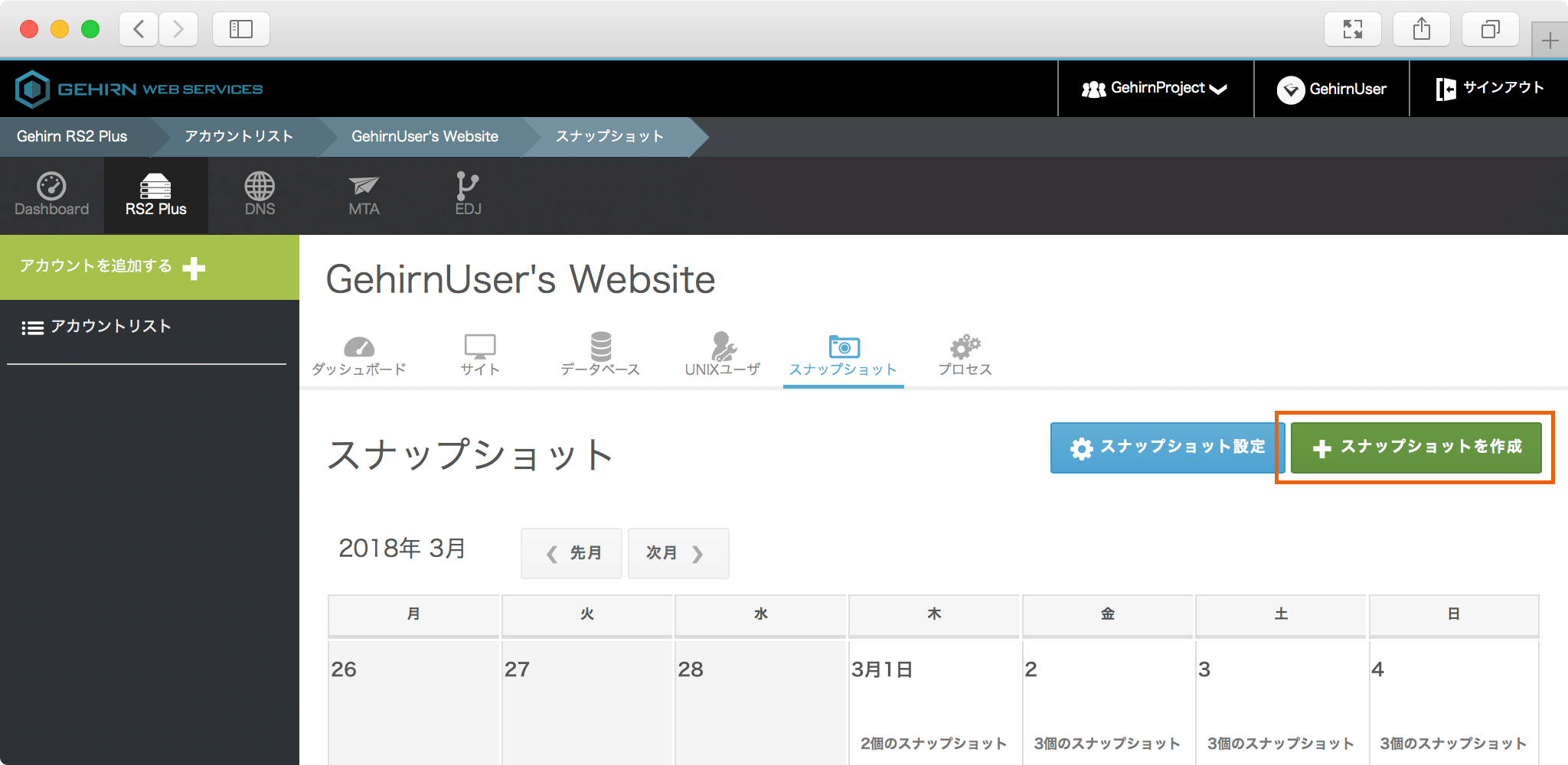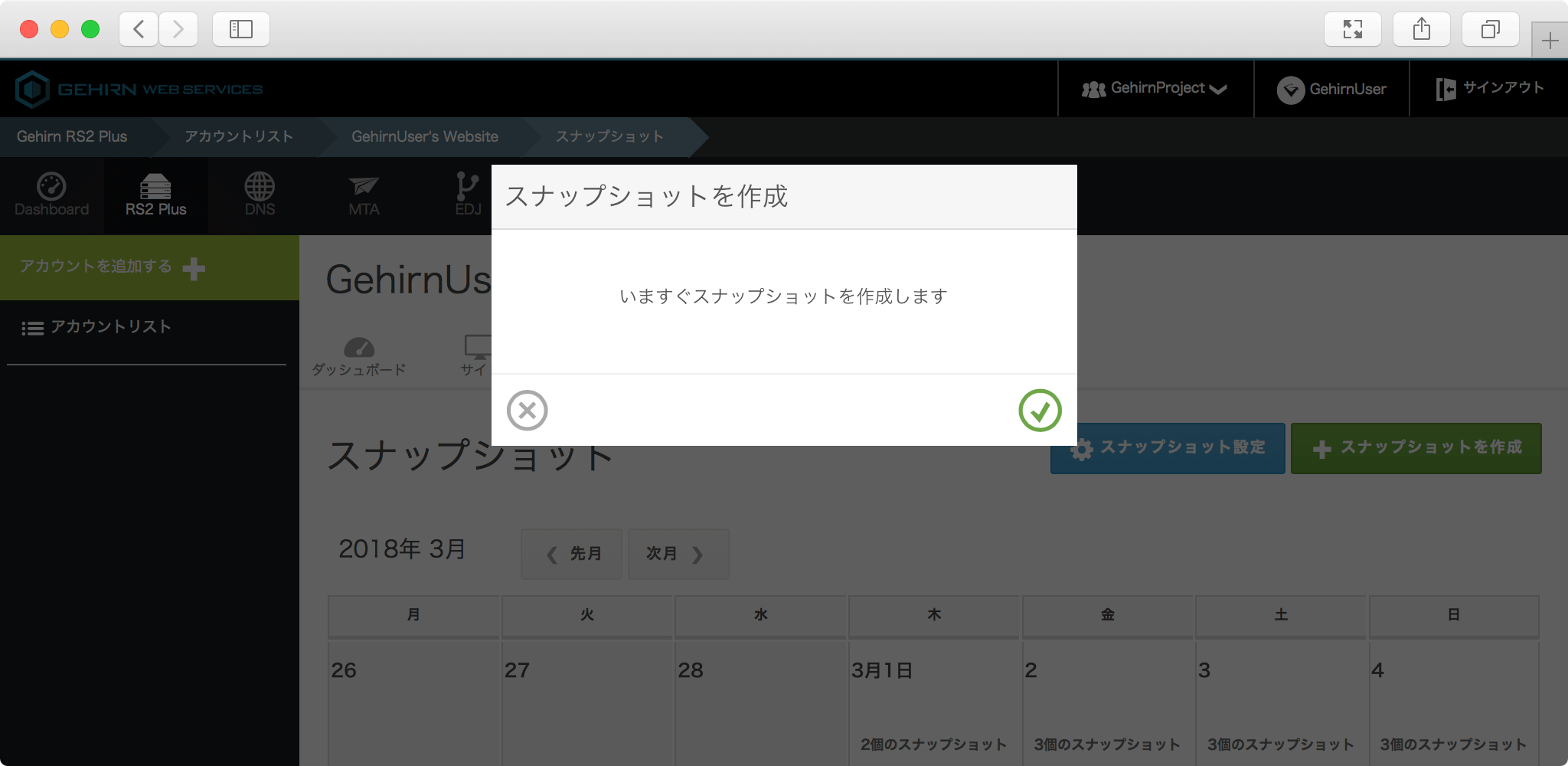 画面右上にある「スナップショットの作成」ボタンをクリックしてモーダルウィンドウを表示します。ウィンドウ右下のチェックマークをクリックすると、スナップショットを作成できます。