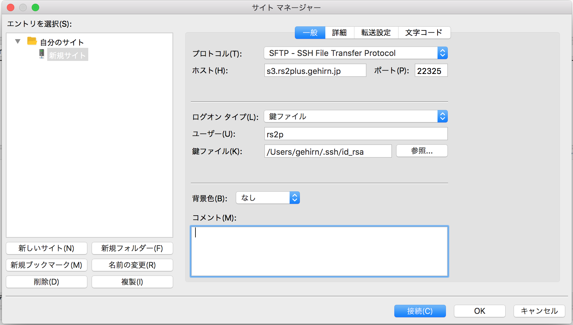 控えた情報を使用して、FileZilla のホスト情報を上のように設定します。