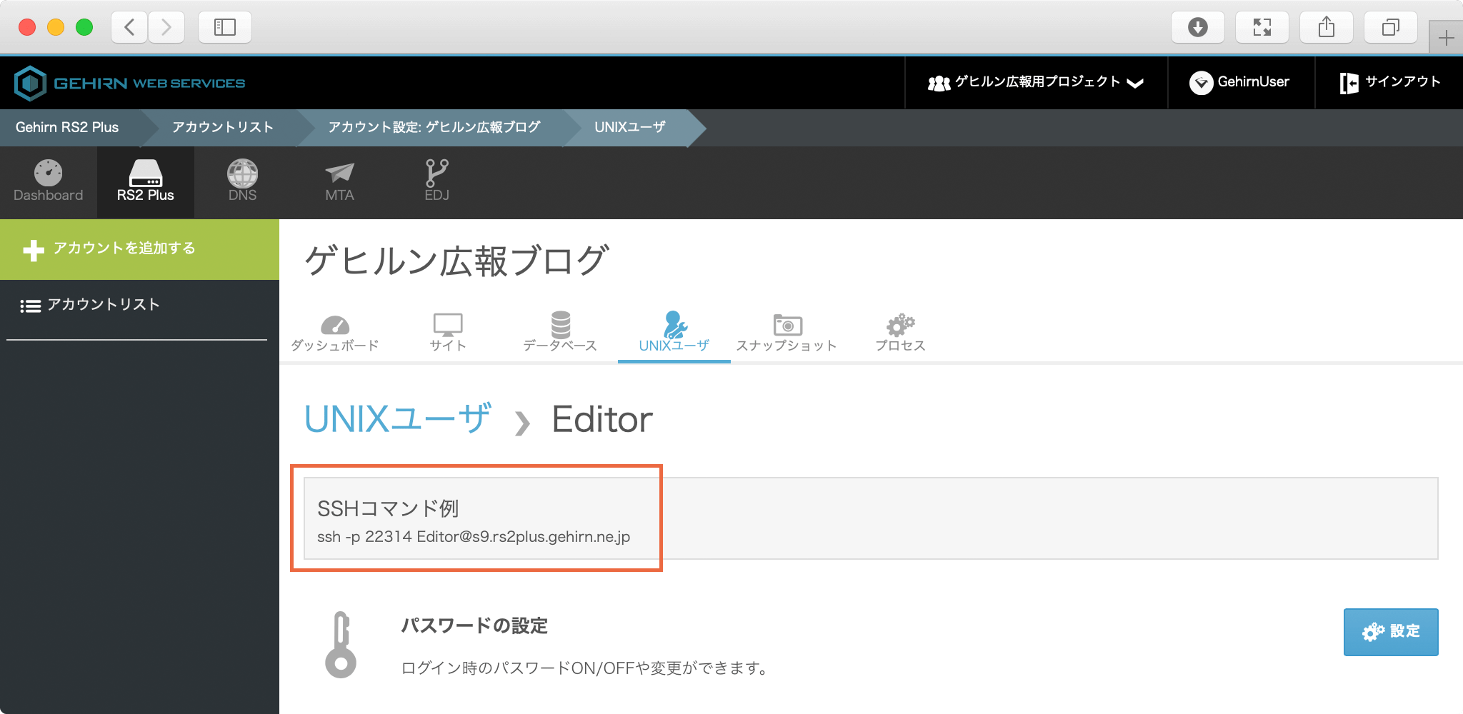 契約一覧の画面から対象のアカウントを開いて、UNIX ユーザタブを選択してください。