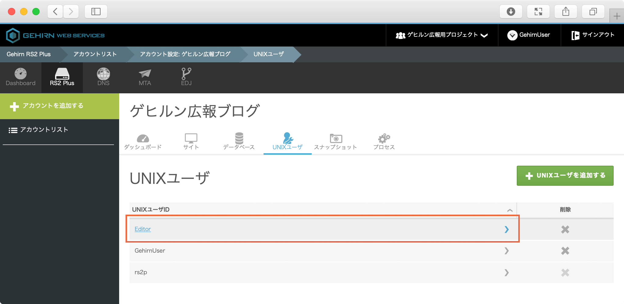 対象のアカウントの UNIX ユーザタブを開く