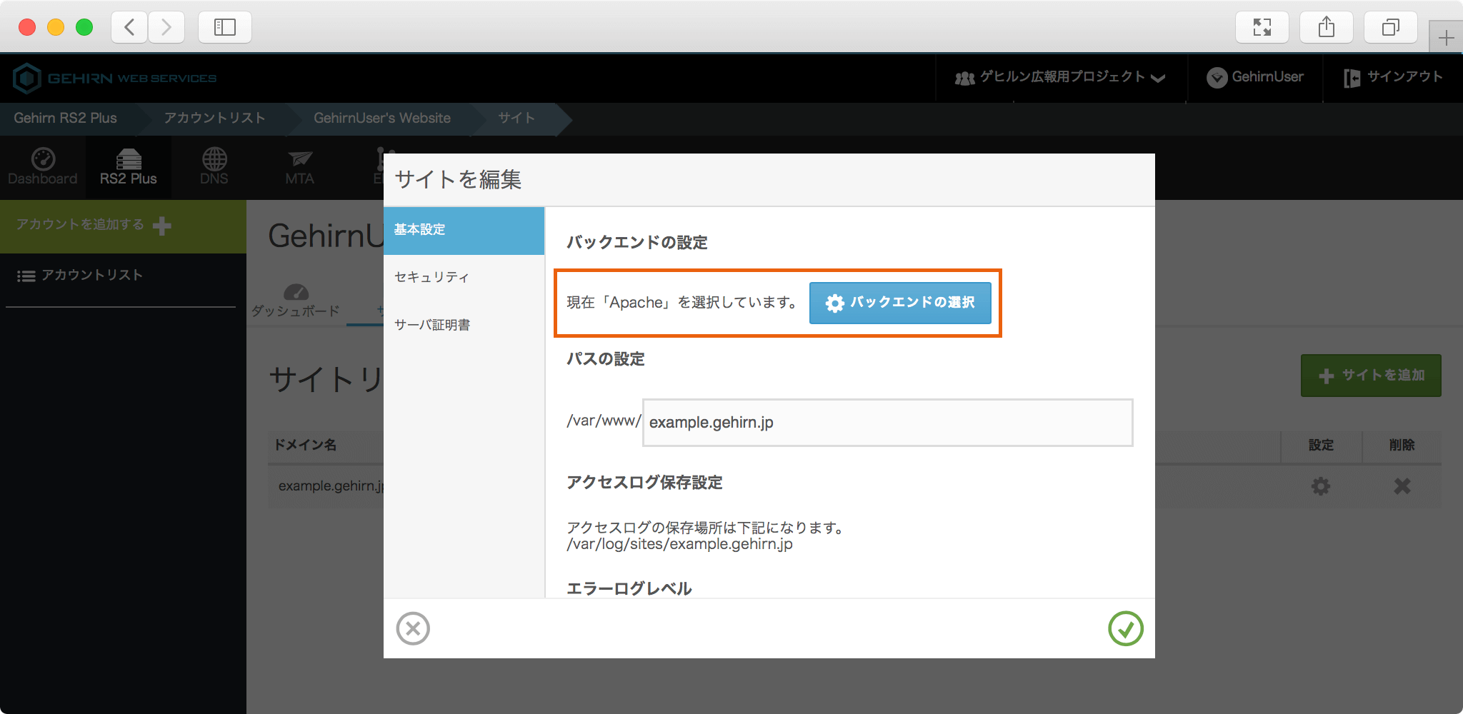 Apache 以外が選択されている方は、「バックエンドの選択」ボタンをクリックして、 「Apache」を選び、確定するボタンをクリックしてください。
