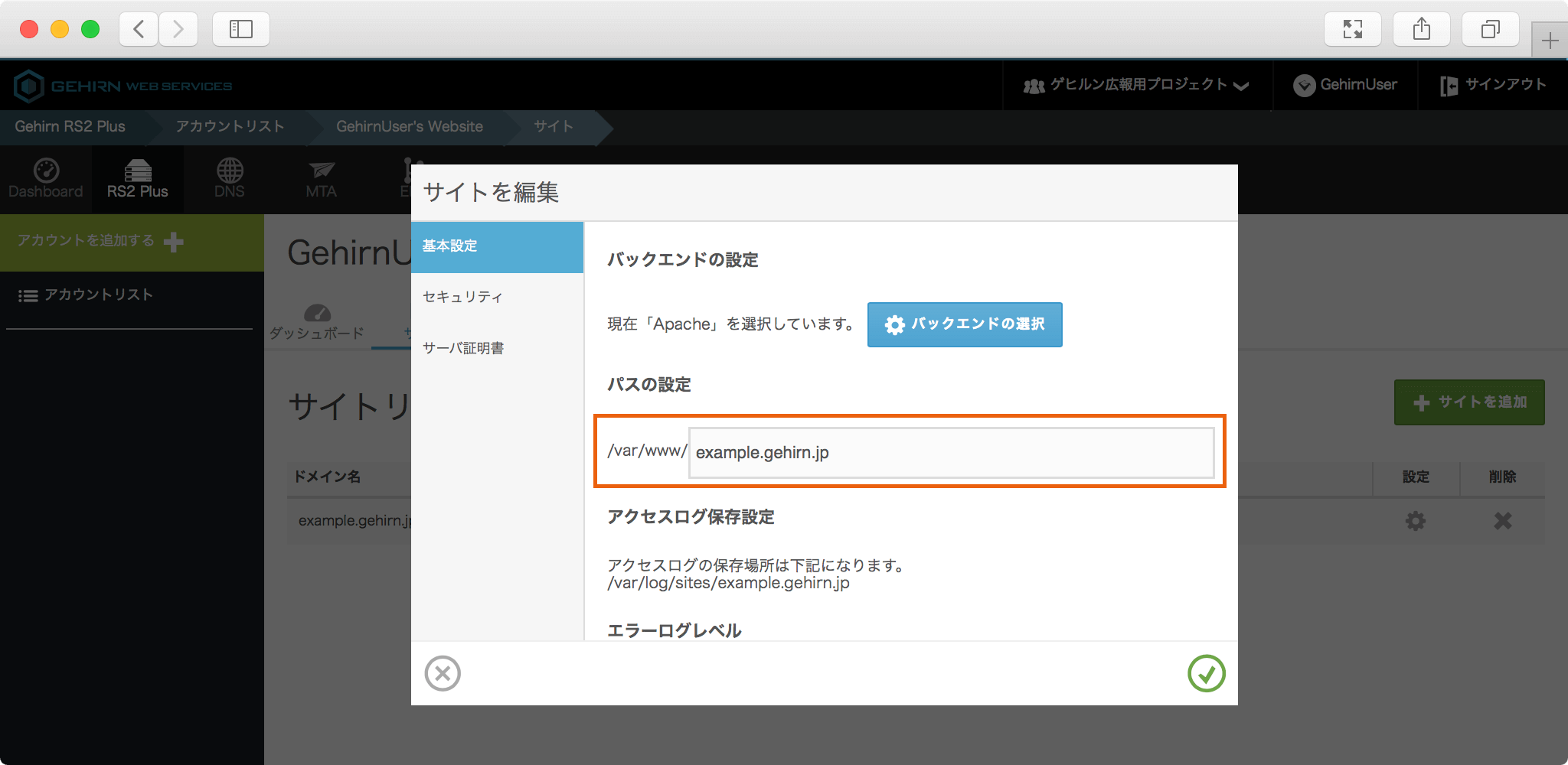 Web サイトのルートディレクトリを設定します。サイトが設置されたディレクトリを入力してください。