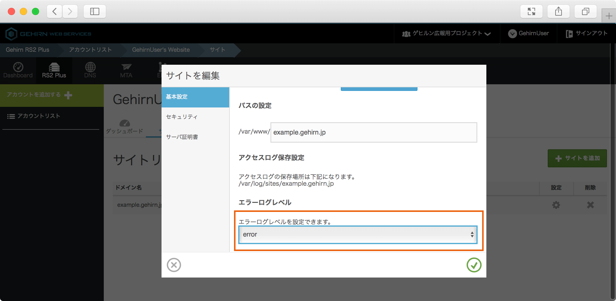 エラーログの出力レベルを設定できます。 とくに設定が不要な方は、デフォルトの「error」を選択してください。